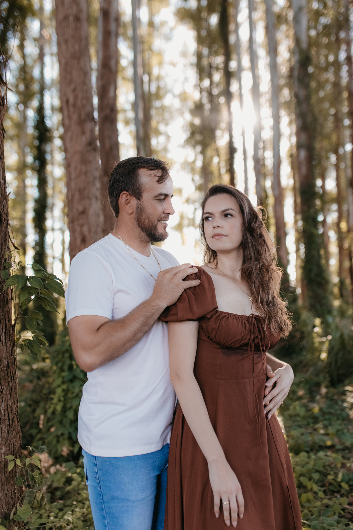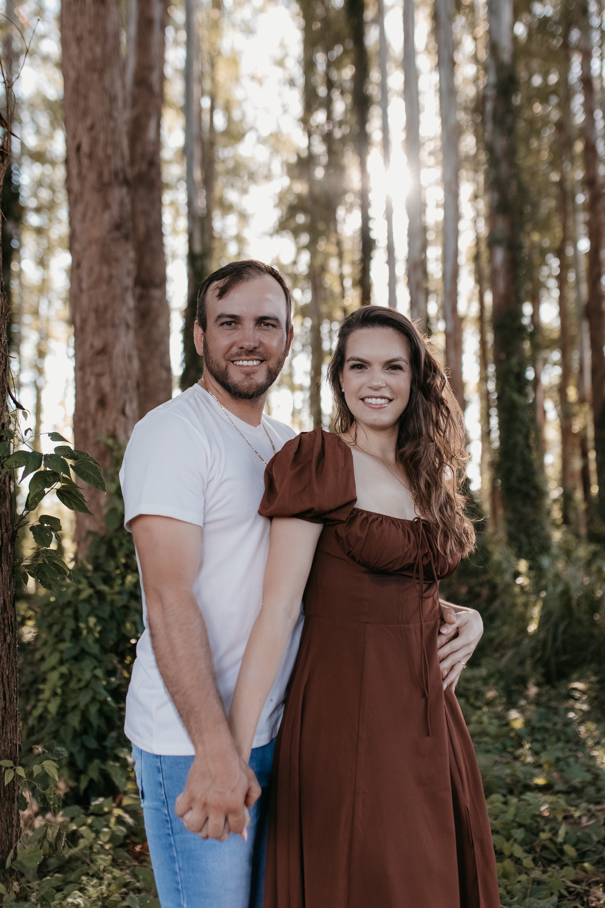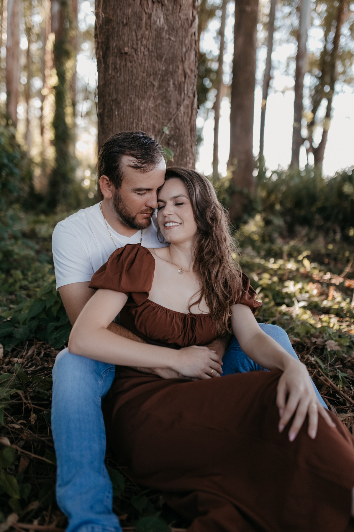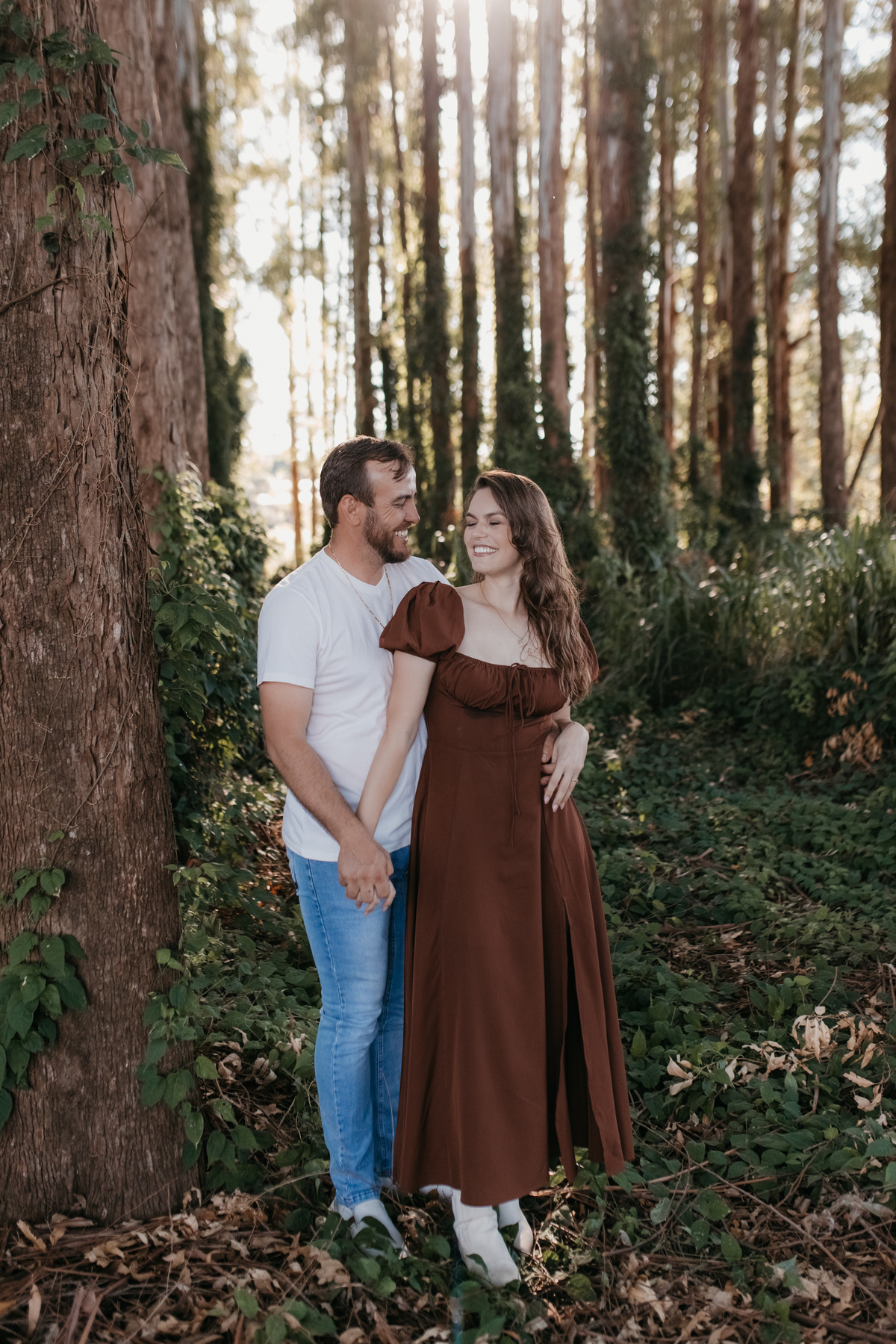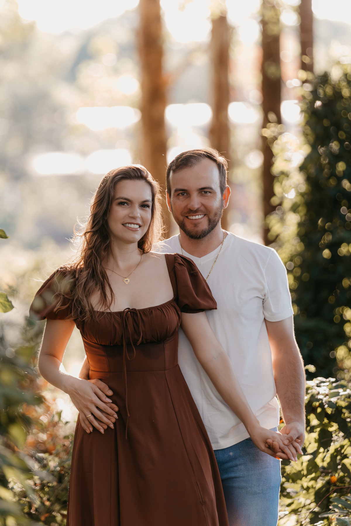 Tivemos uma tarde linda, céu limpo, clima agradável e um belo entardecer. Começamos o ensaio em um bosque, onde a luz do sol atravessava suavemente as árvores, criando um belo cenário.