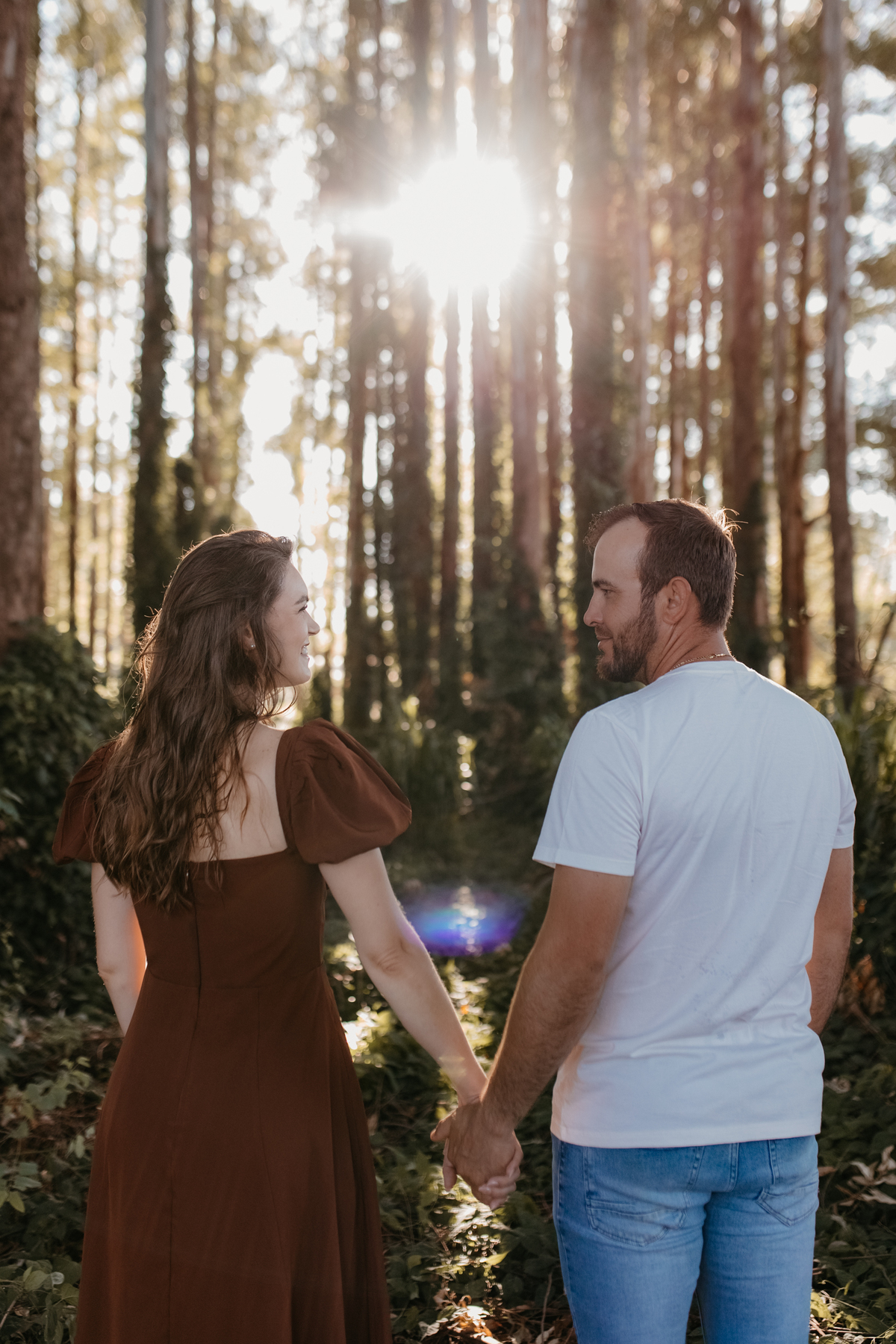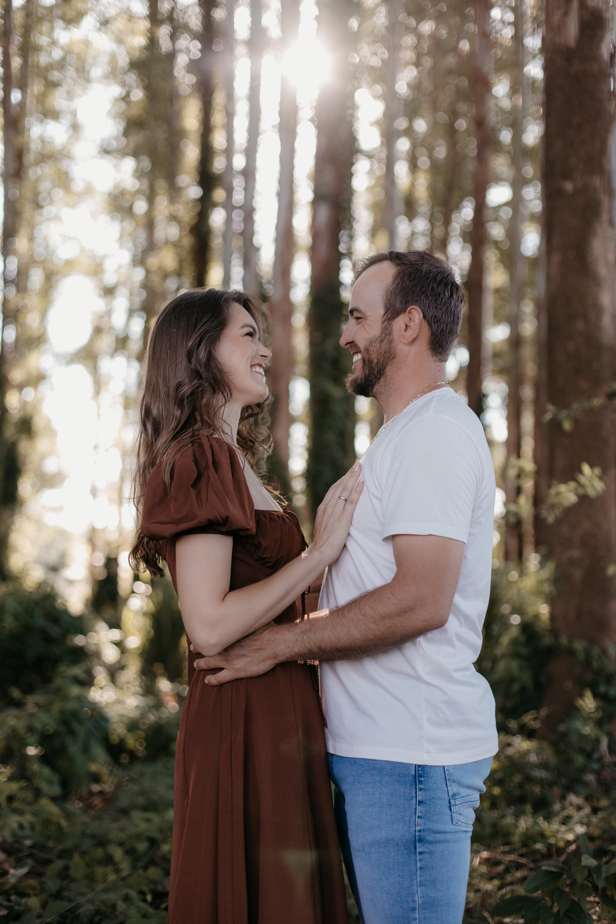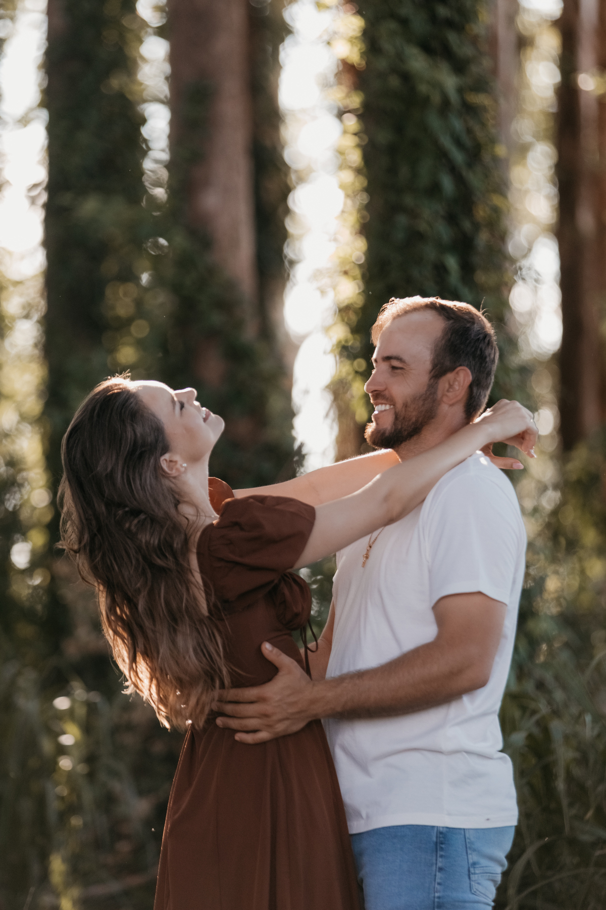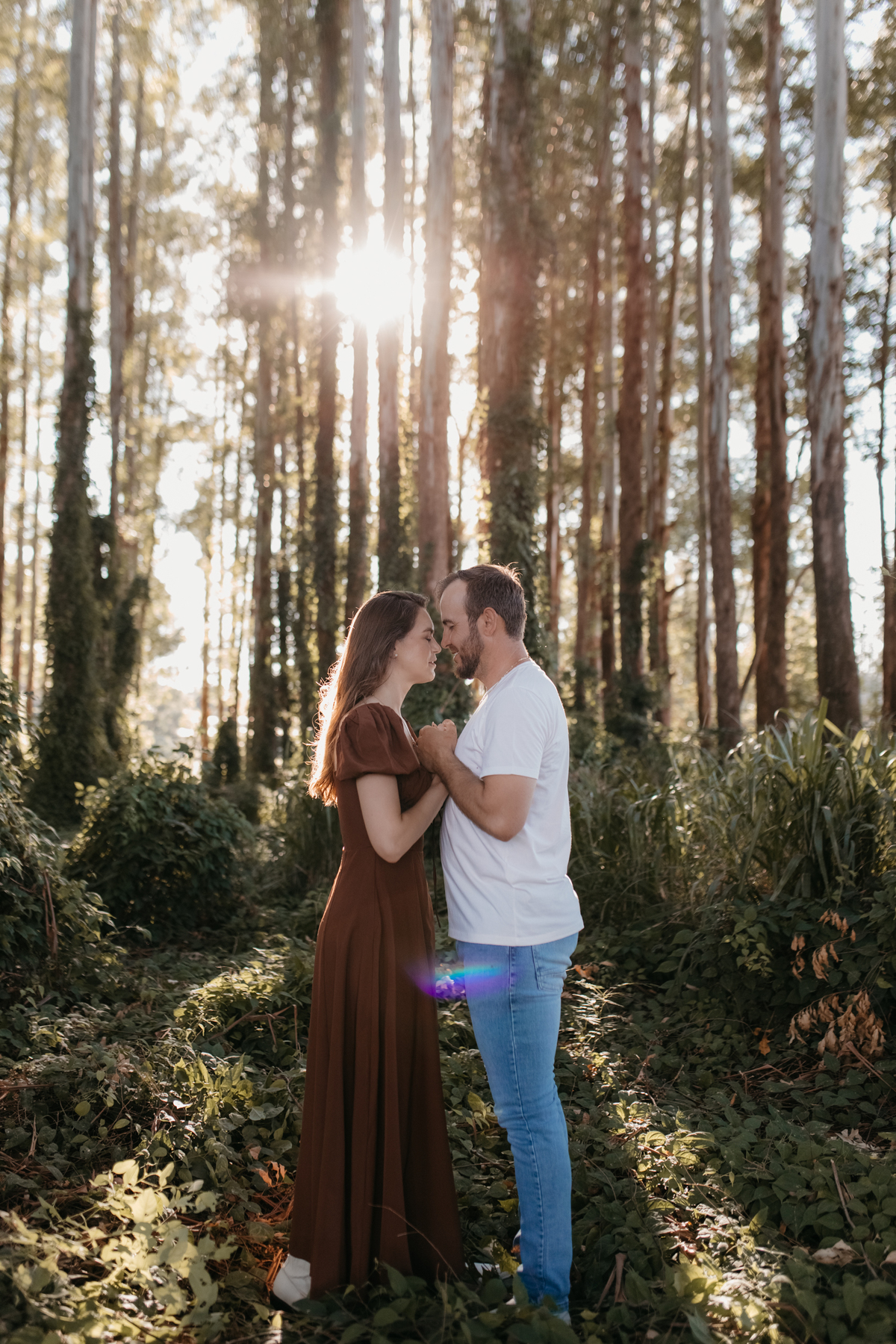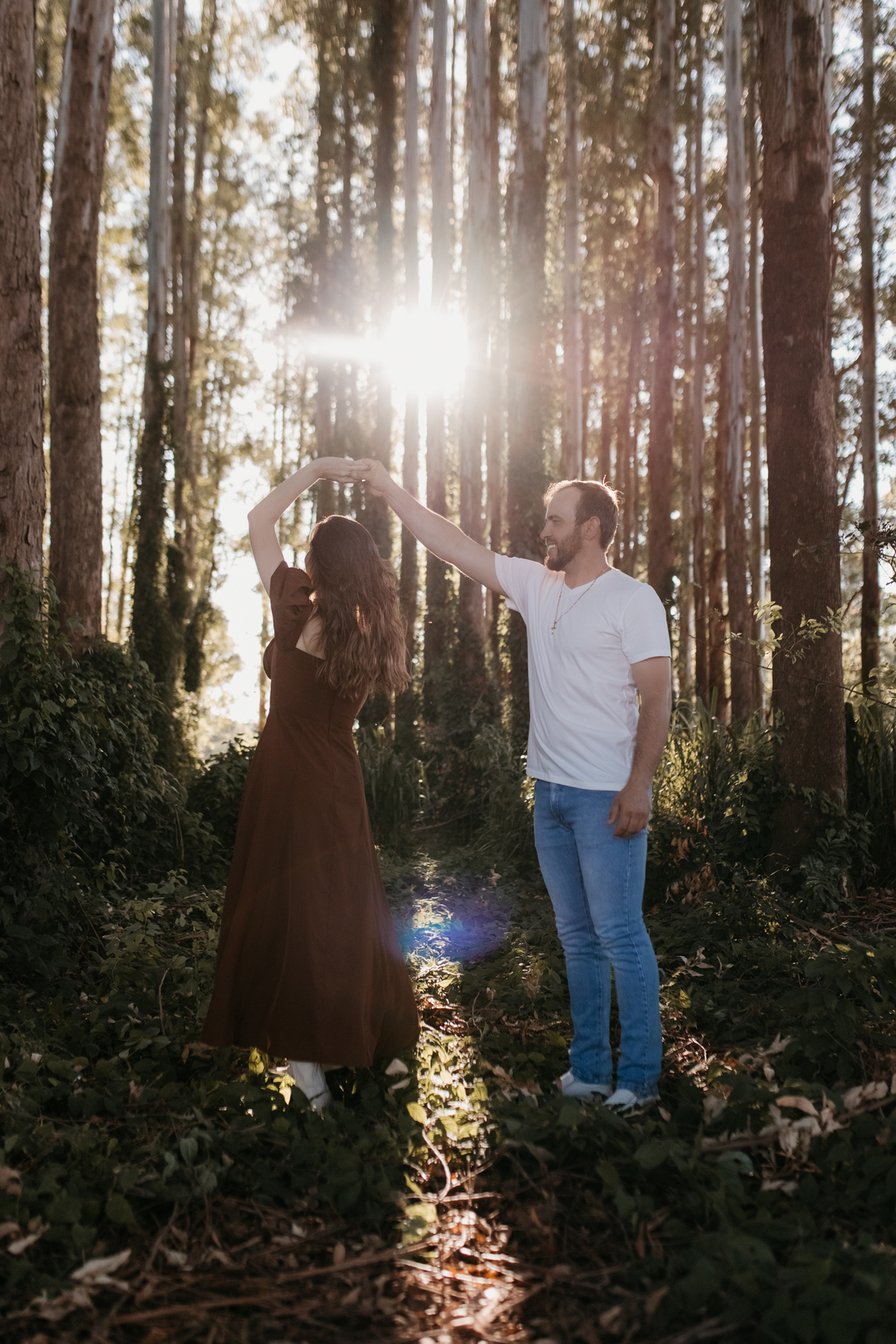 Tivemos uma tarde linda, céu limpo, clima agradável e um belo entardecer. Começamos o ensaio em um bosque, onde a luz do sol atravessava suavemente as árvores, criando um belo cenário.