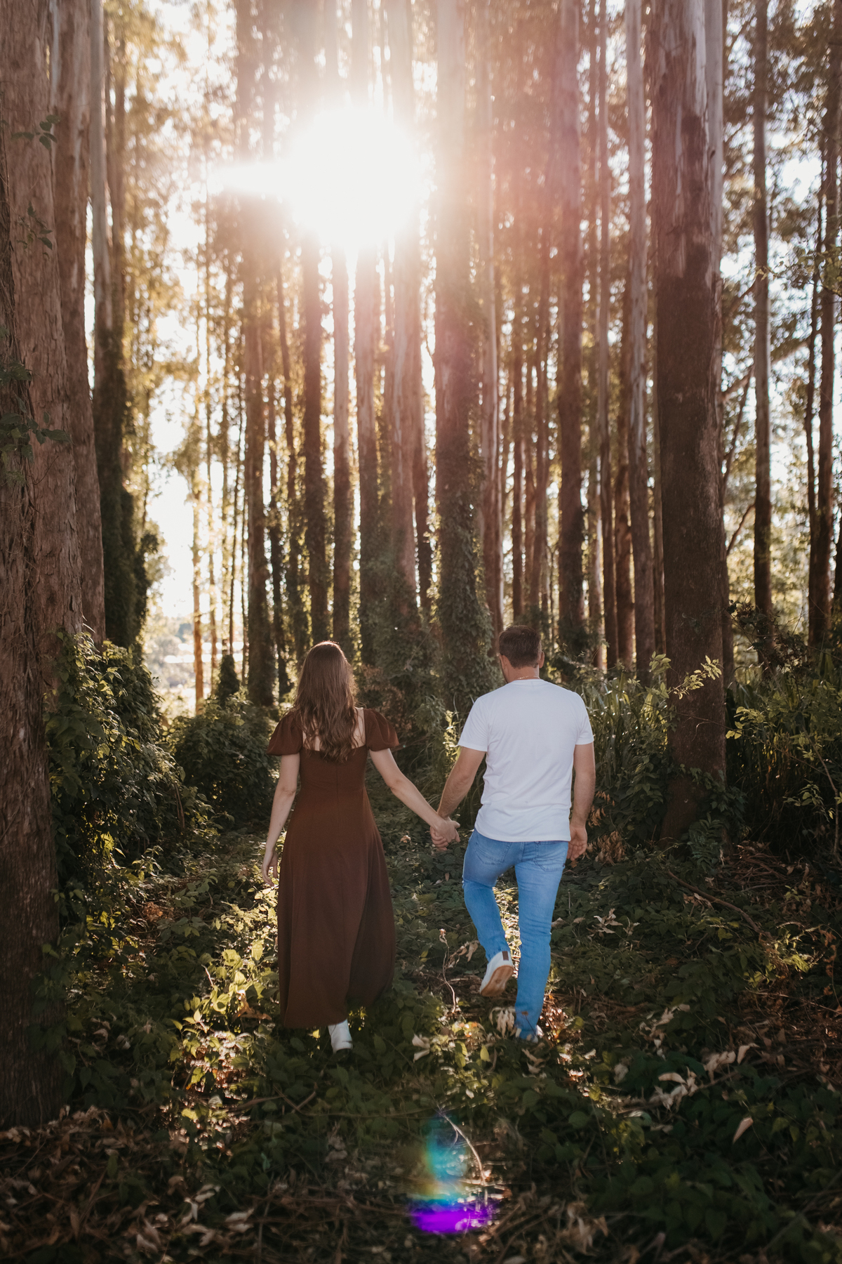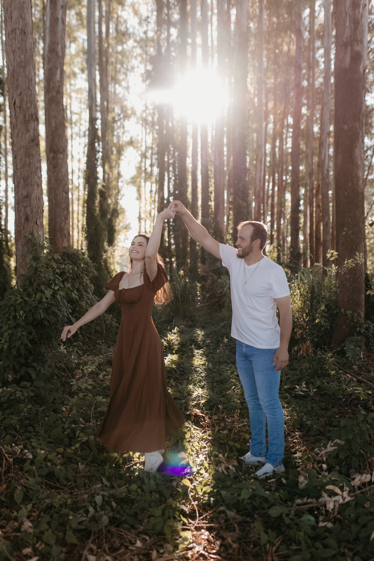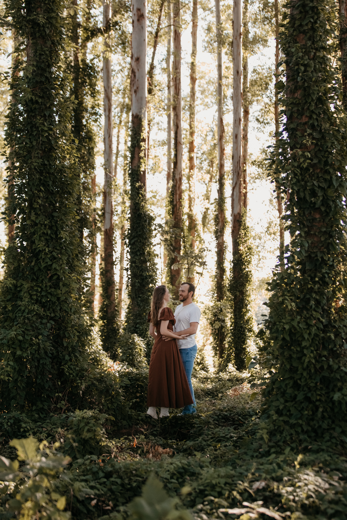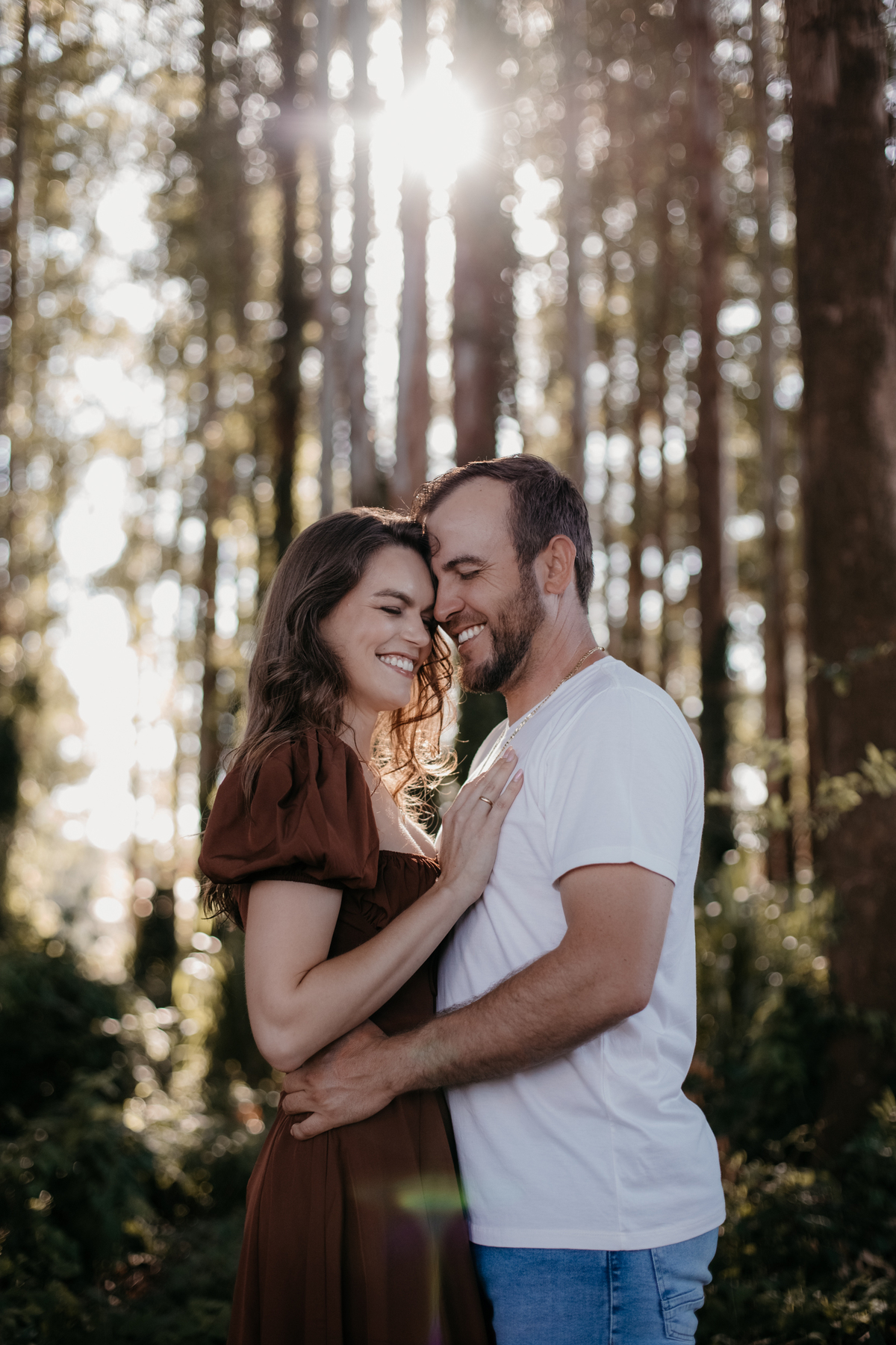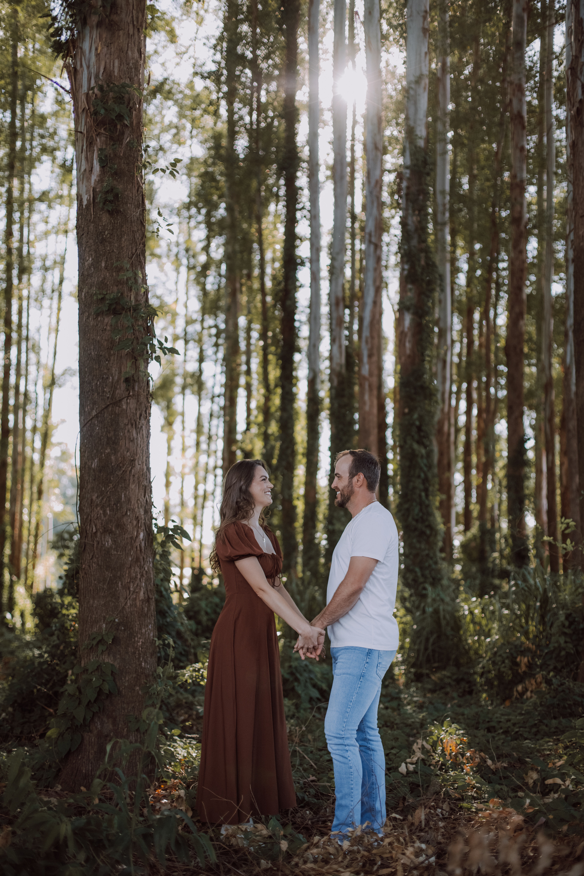 Tivemos uma tarde linda, céu limpo, clima agradável e um belo entardecer. Começamos o ensaio em um bosque, onde a luz do sol atravessava suavemente as árvores, criando um belo cenário.