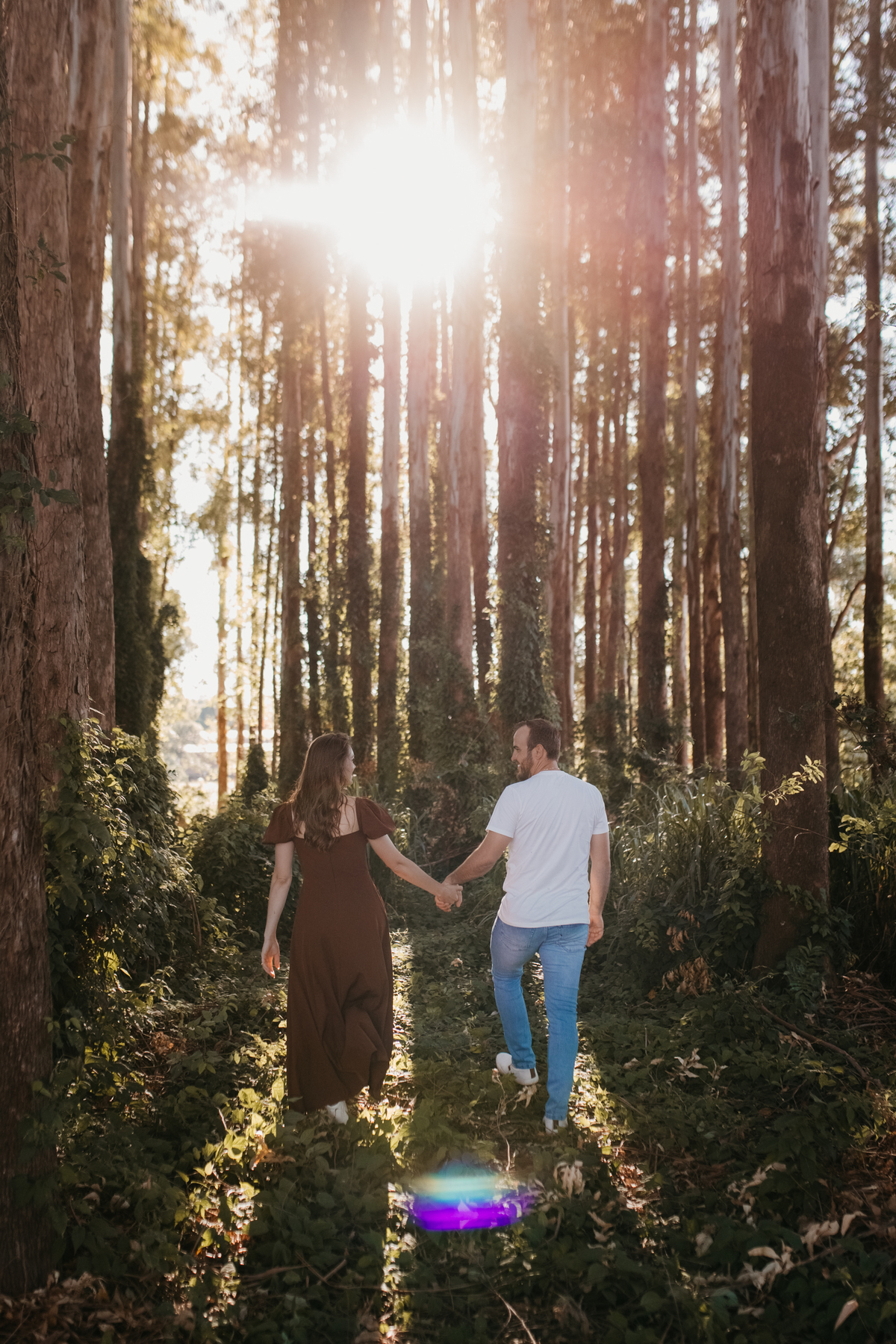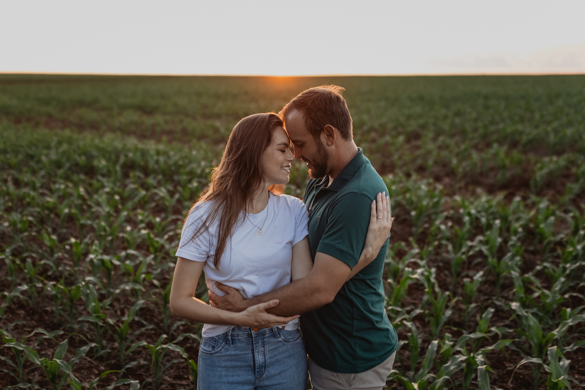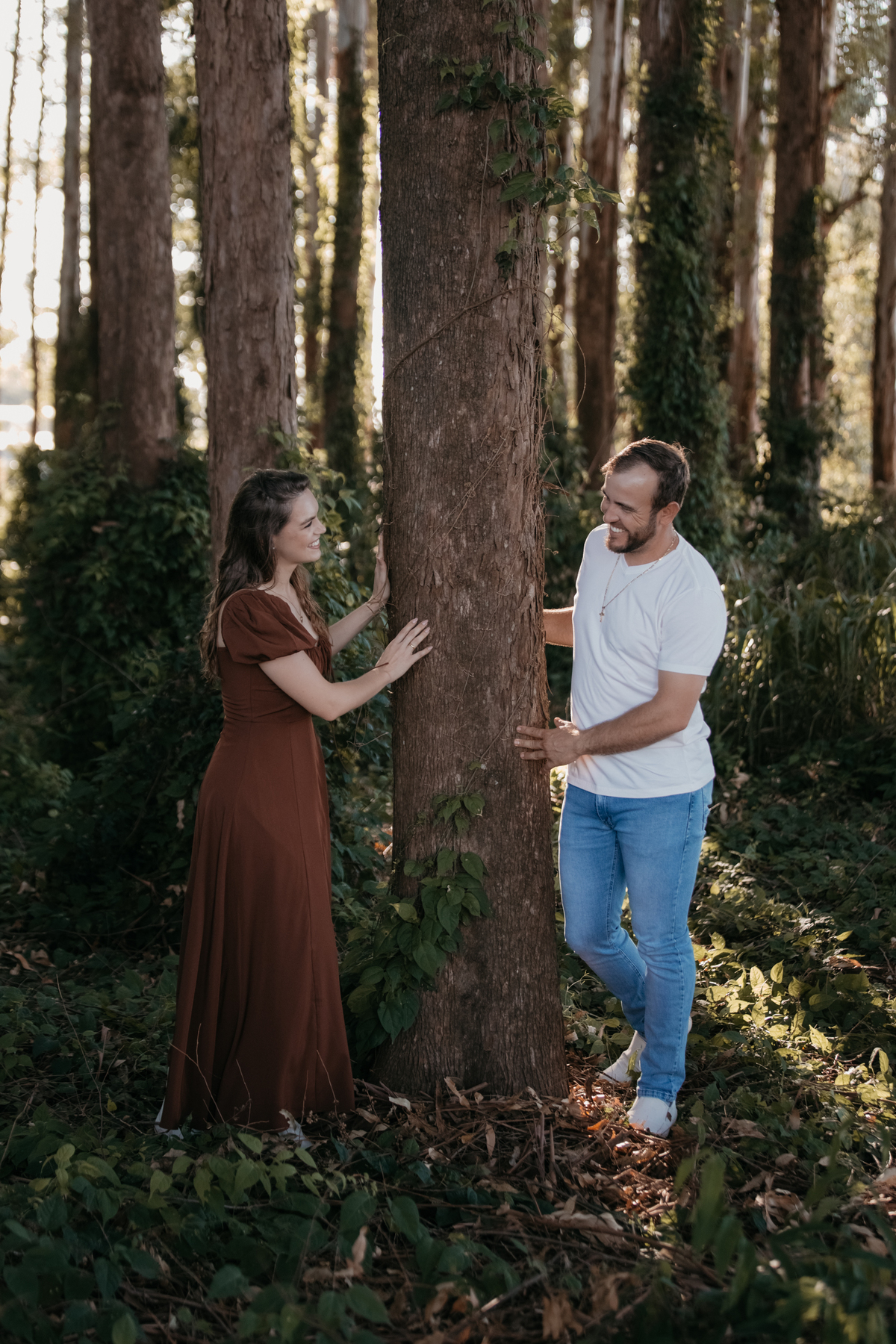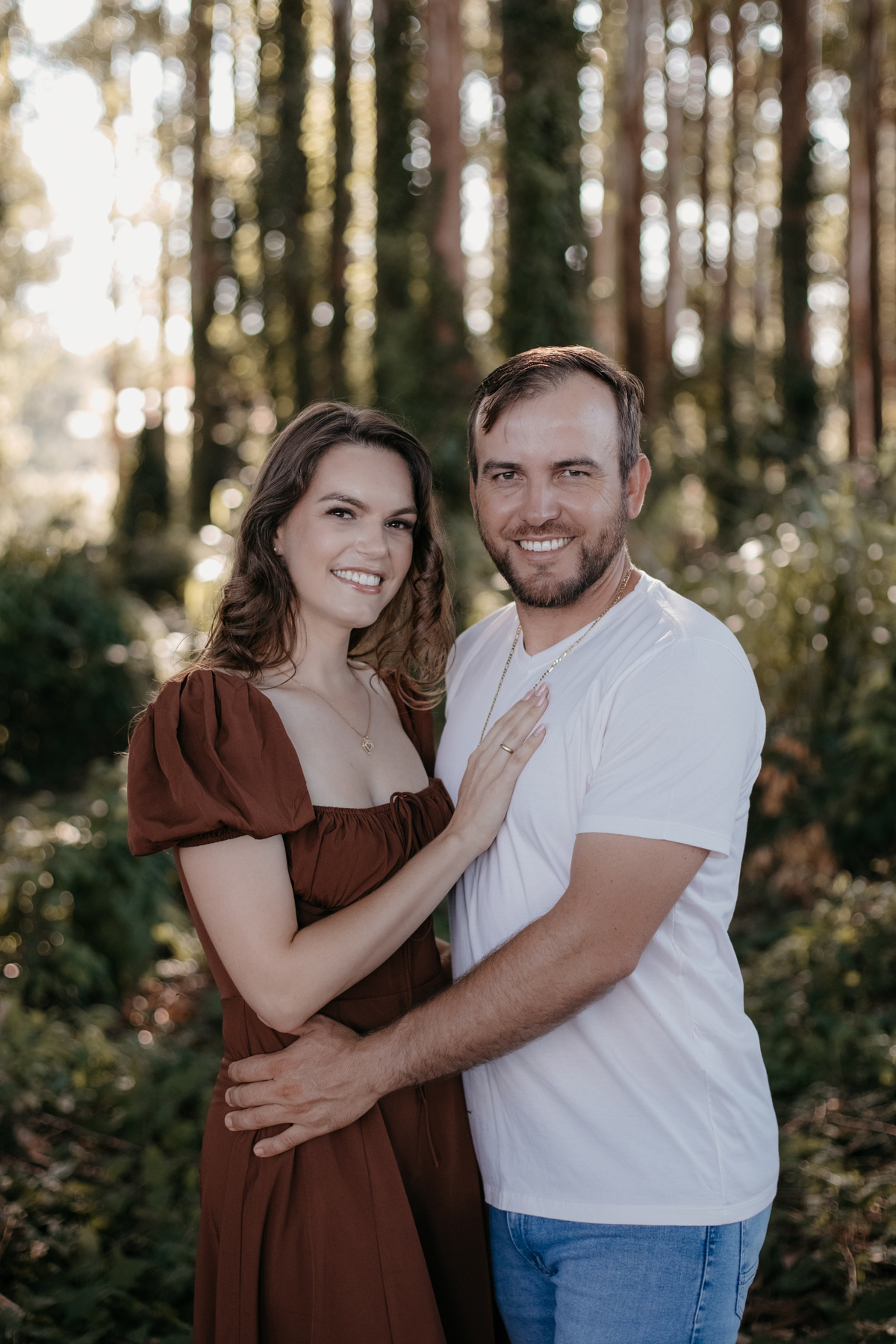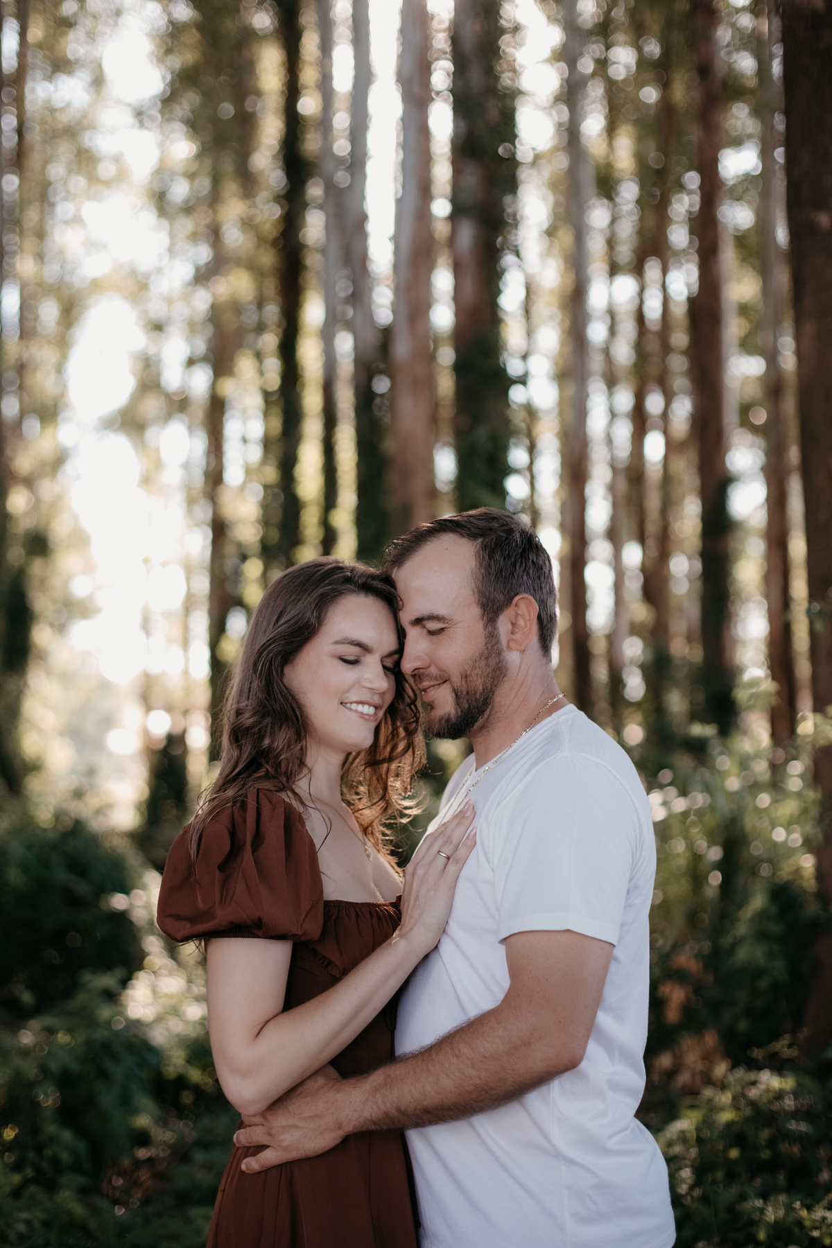 Tivemos uma tarde linda, céu limpo, clima agradável e um belo entardecer. Começamos o ensaio em um bosque, onde a luz do sol atravessava suavemente as árvores, criando um belo cenário.