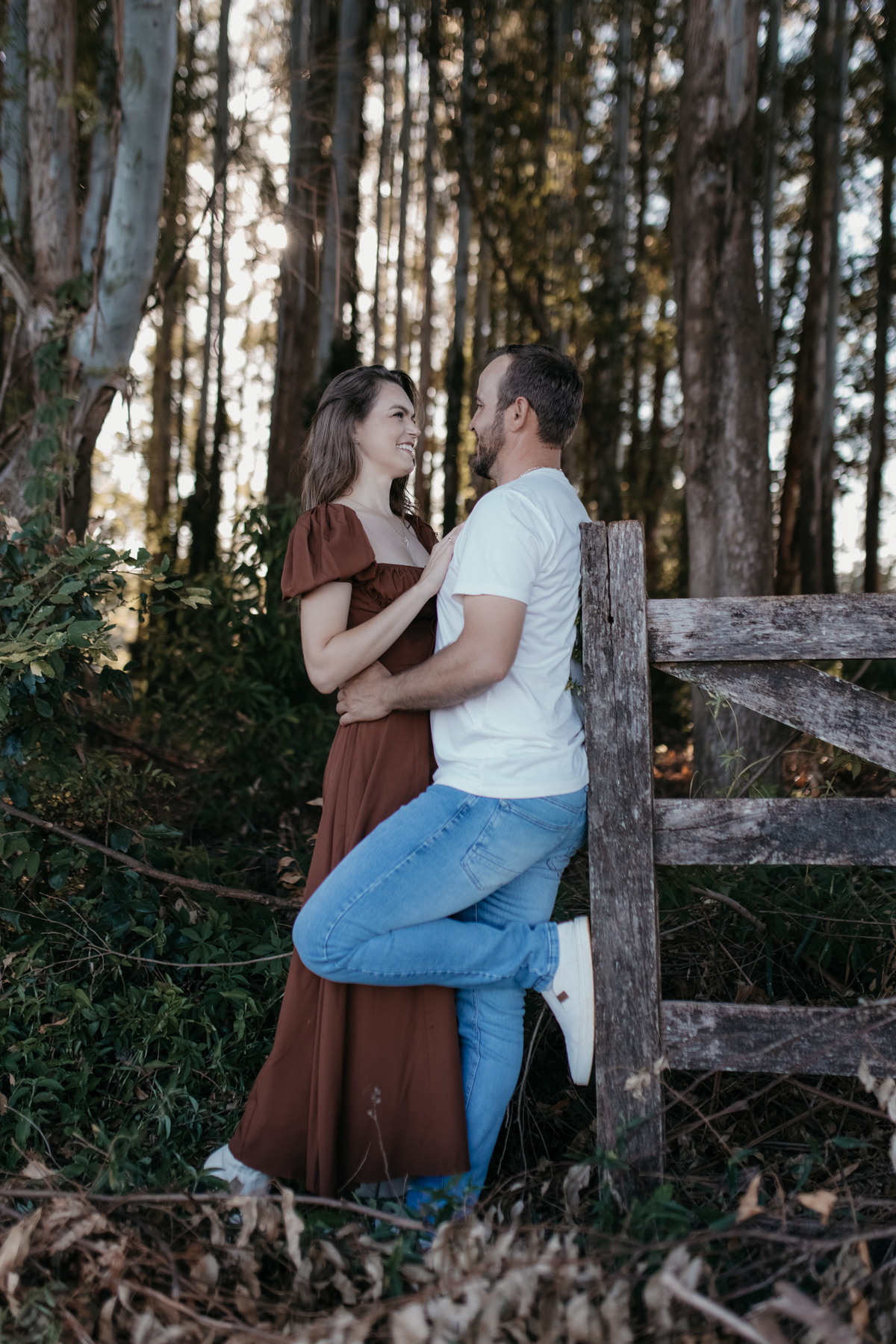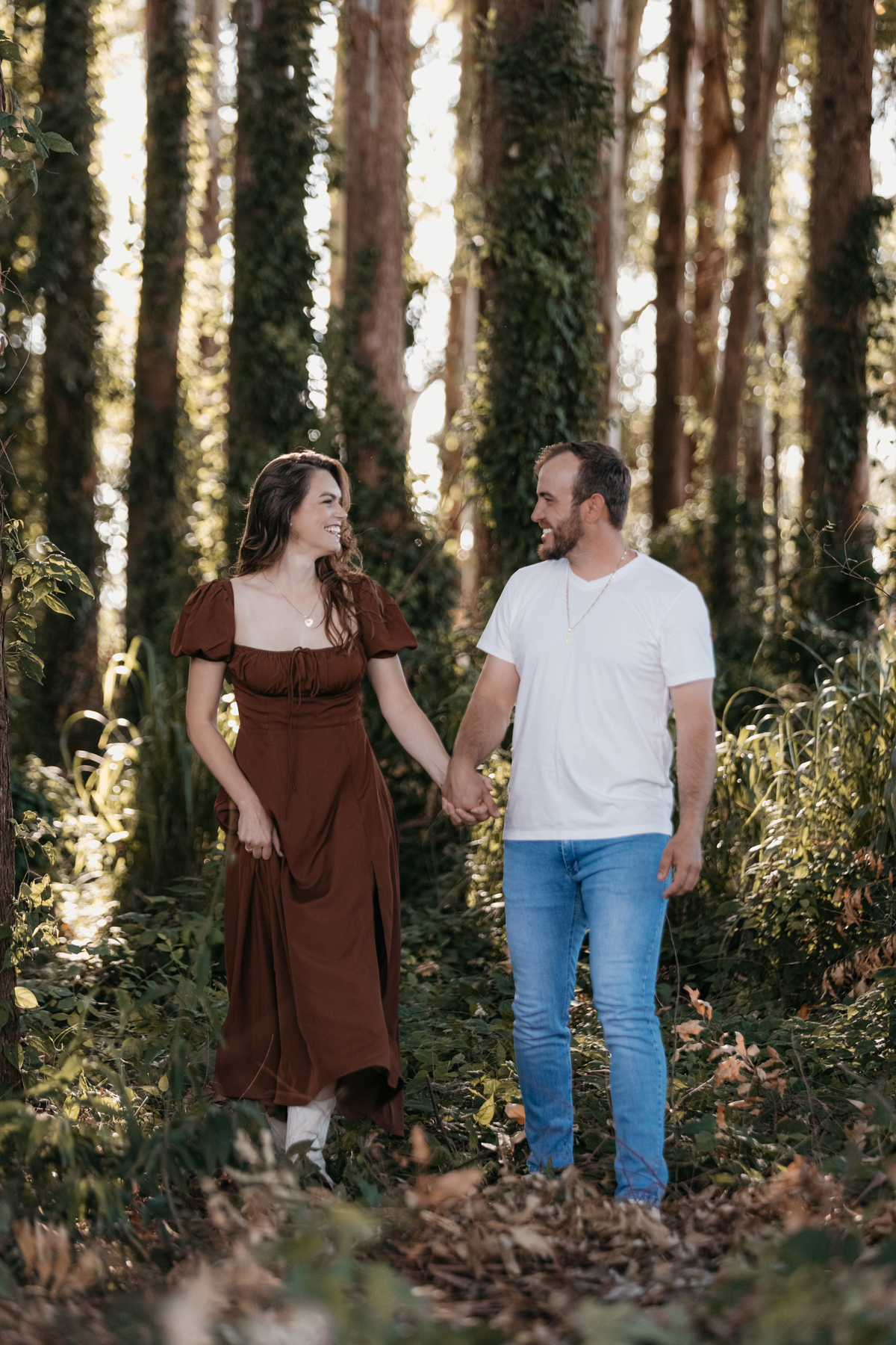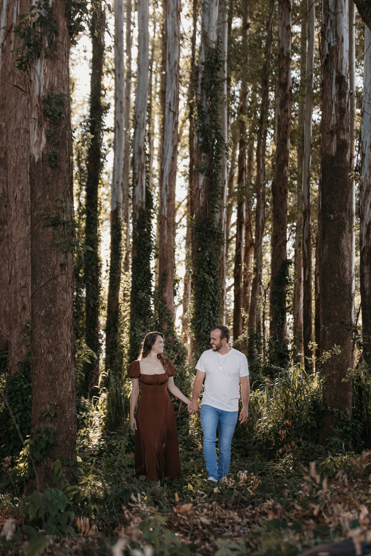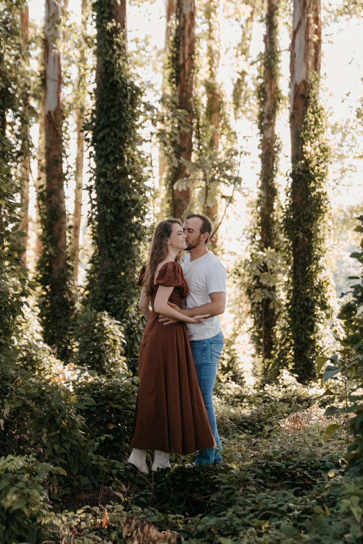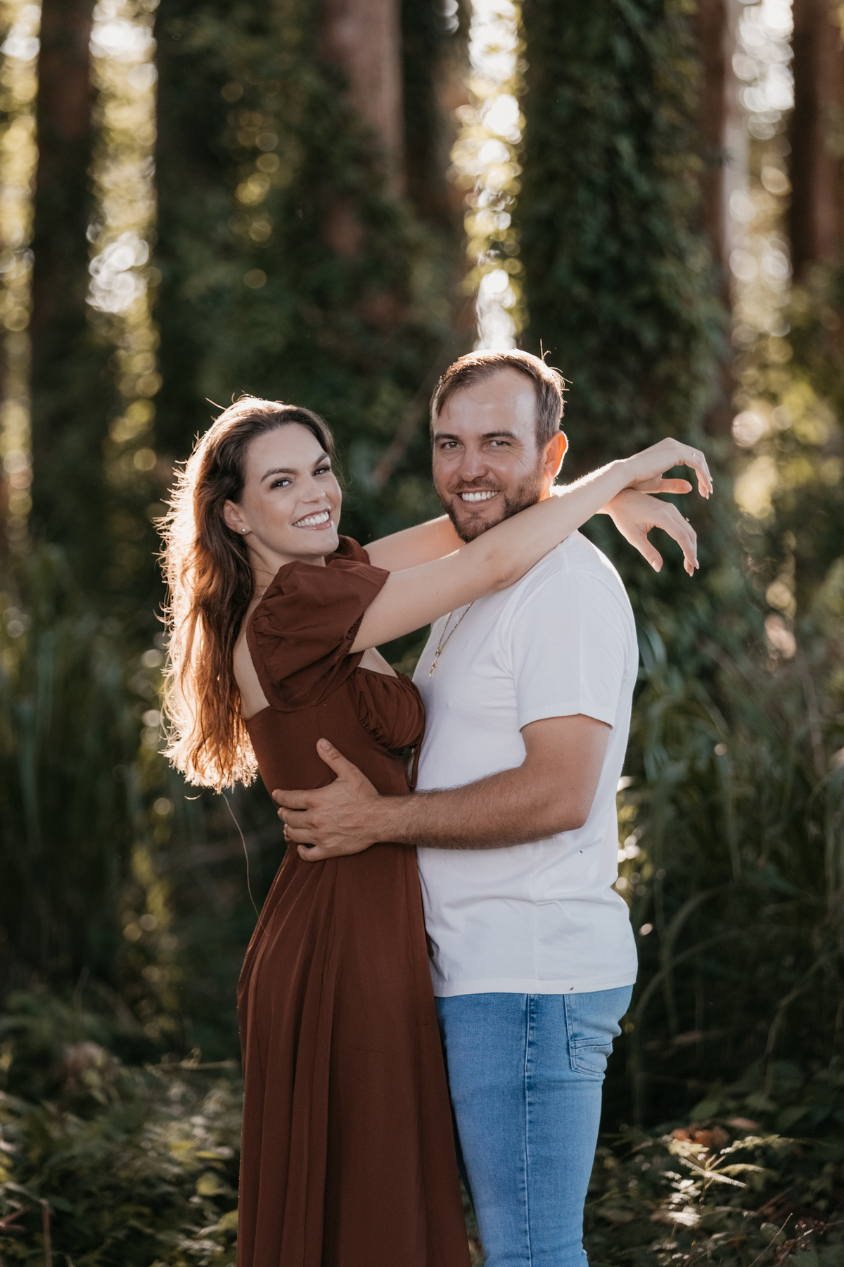 Tivemos uma tarde linda, céu limpo, clima agradável e um belo entardecer. Começamos o ensaio em um bosque, onde a luz do sol atravessava suavemente as árvores, criando um belo cenário.