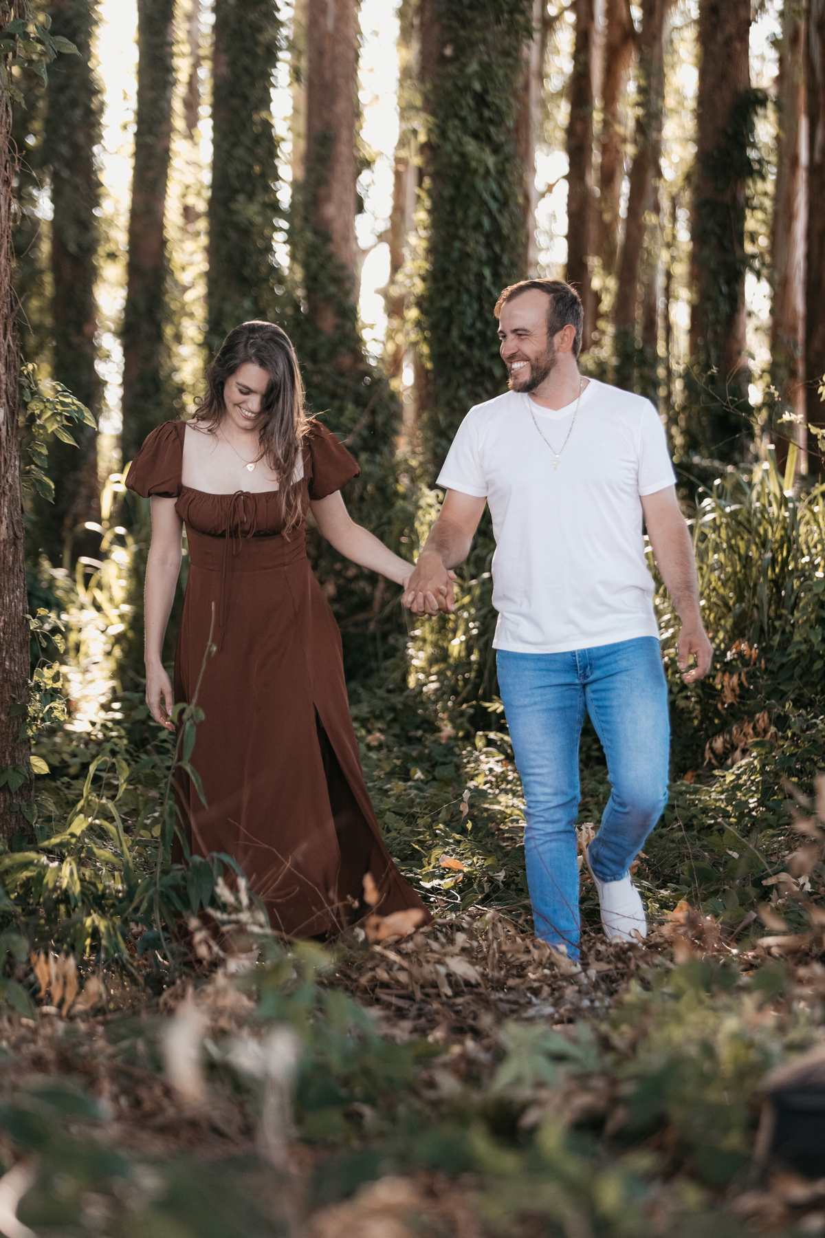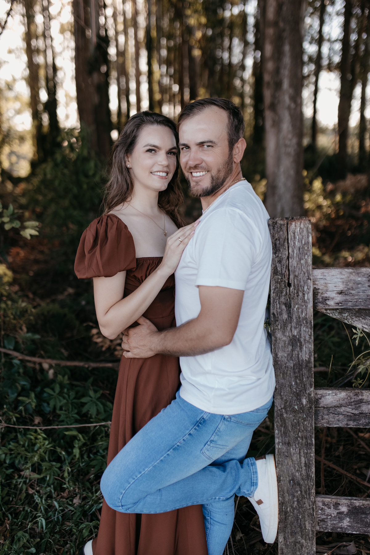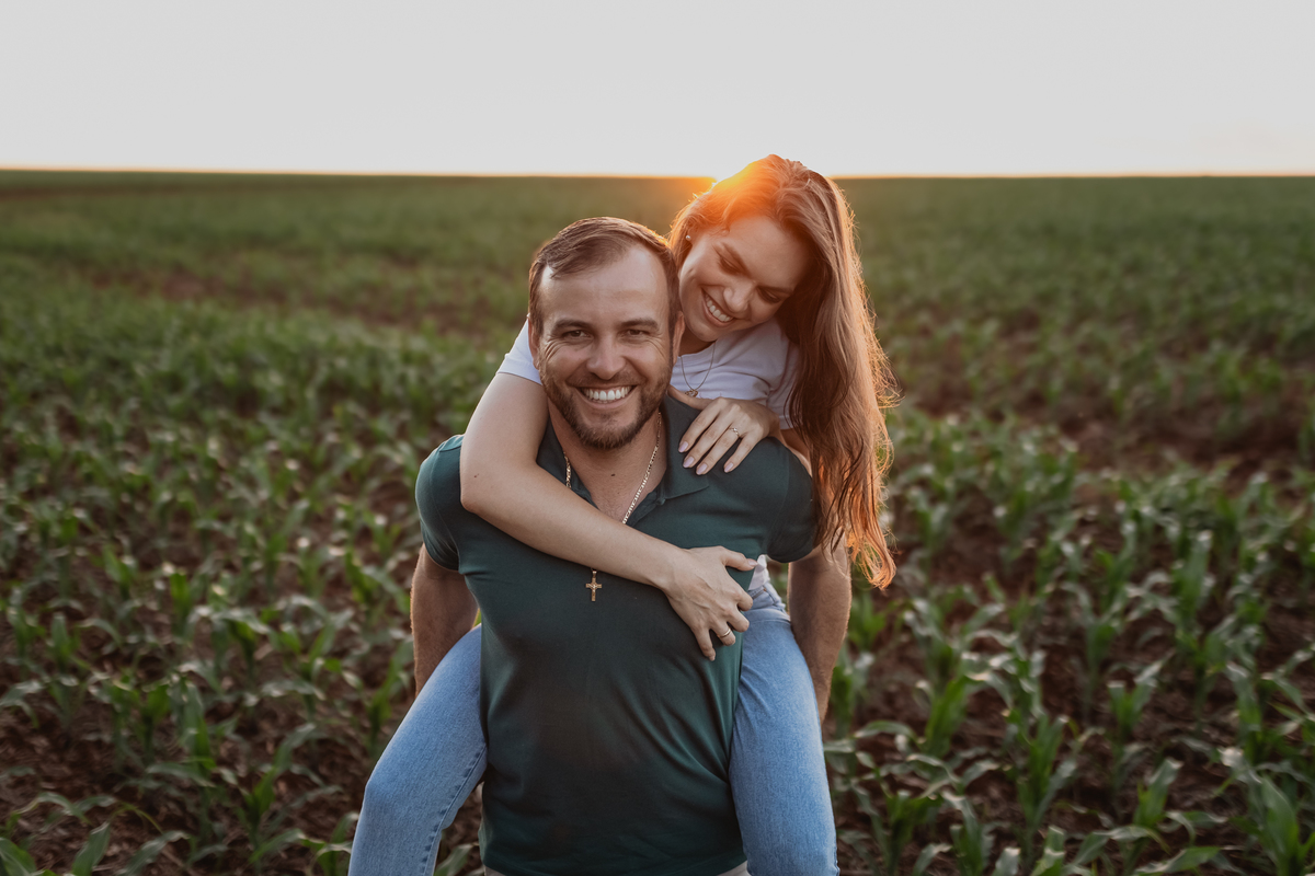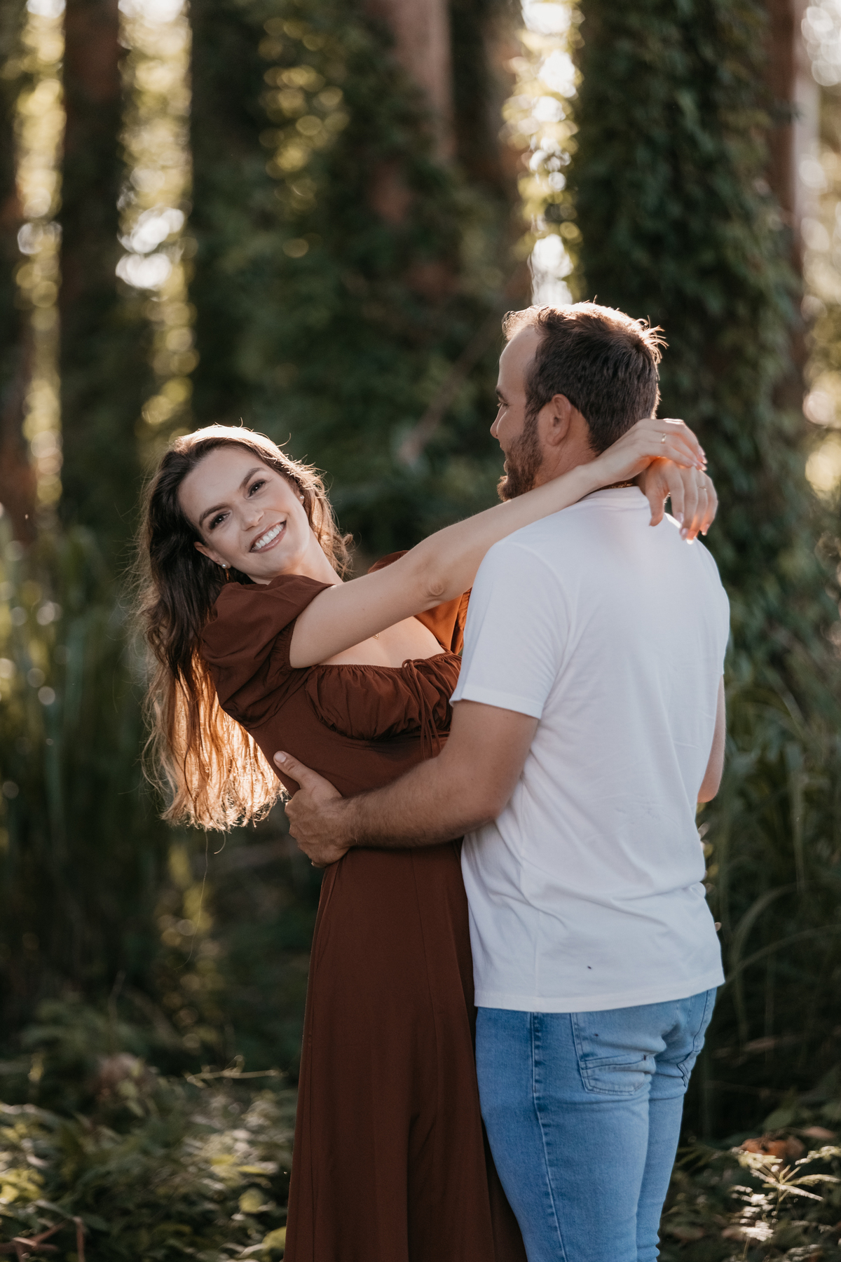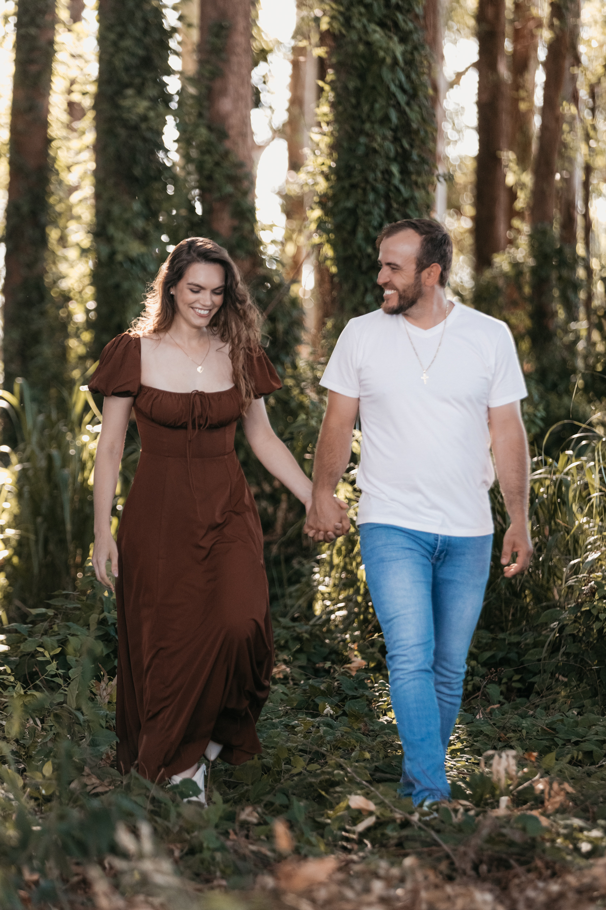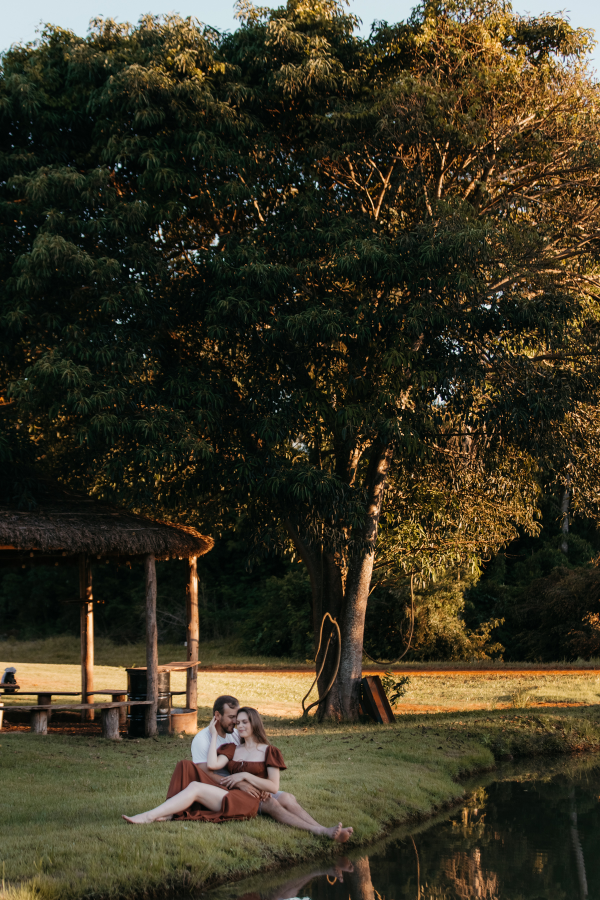 Tivemos uma tarde linda, céu limpo, clima agradável e um belo entardecer. Começamos o ensaio em um bosque, onde a luz do sol atravessava suavemente as árvores, criando um belo cenário.