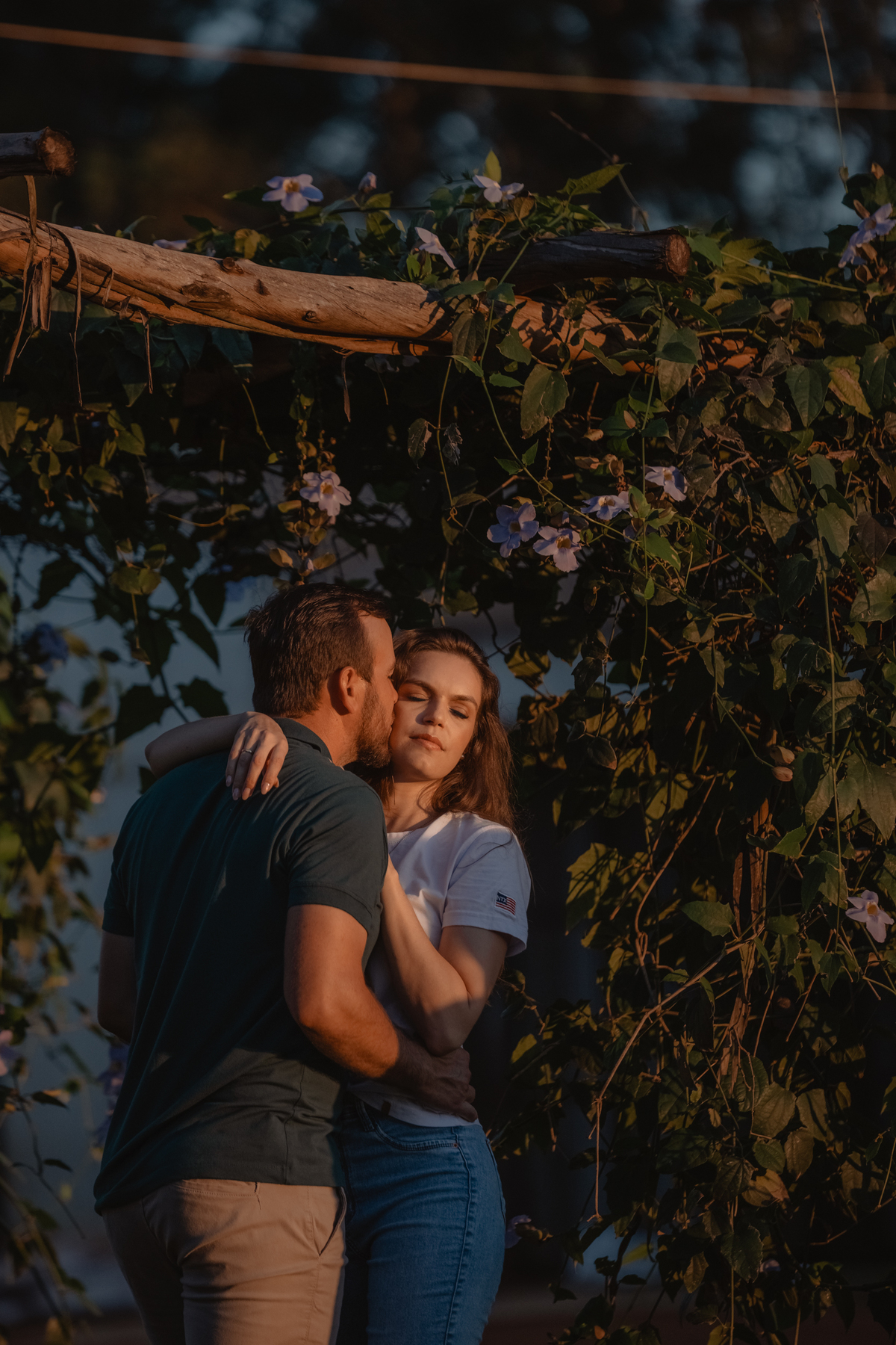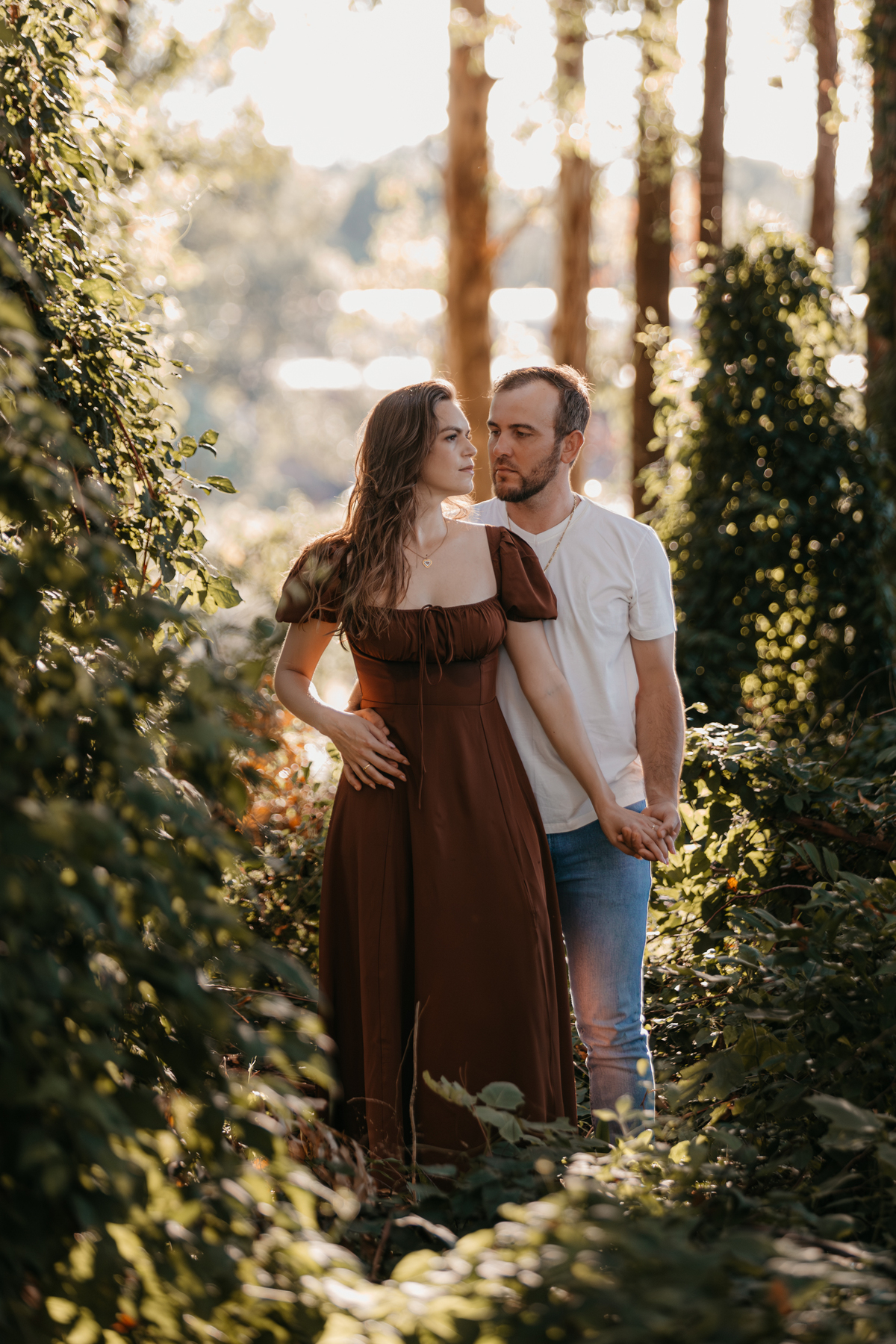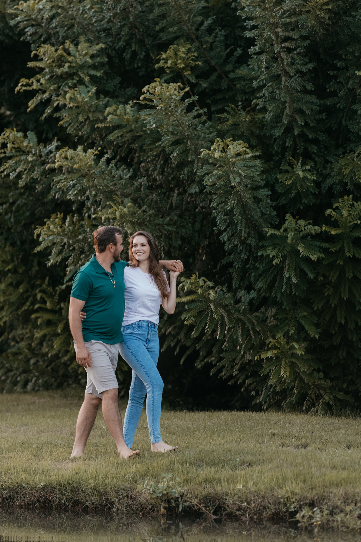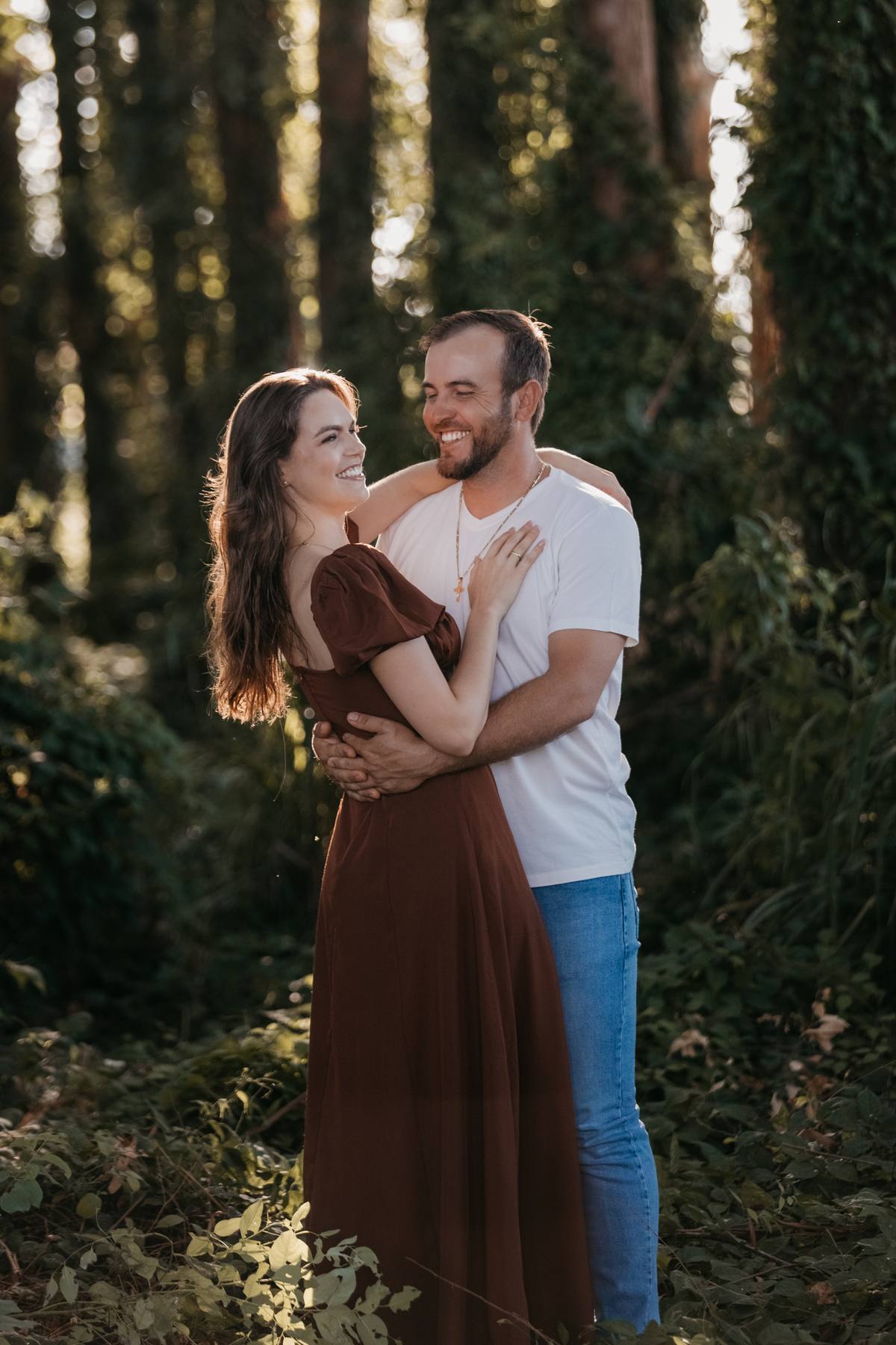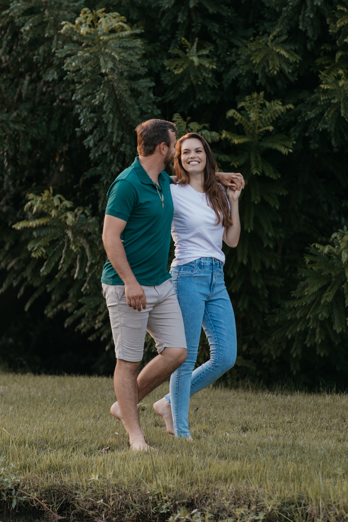 Tivemos uma tarde linda, céu limpo, clima agradável e um belo entardecer. Começamos o ensaio em um bosque, onde a luz do sol atravessava suavemente as árvores, criando um belo cenário.