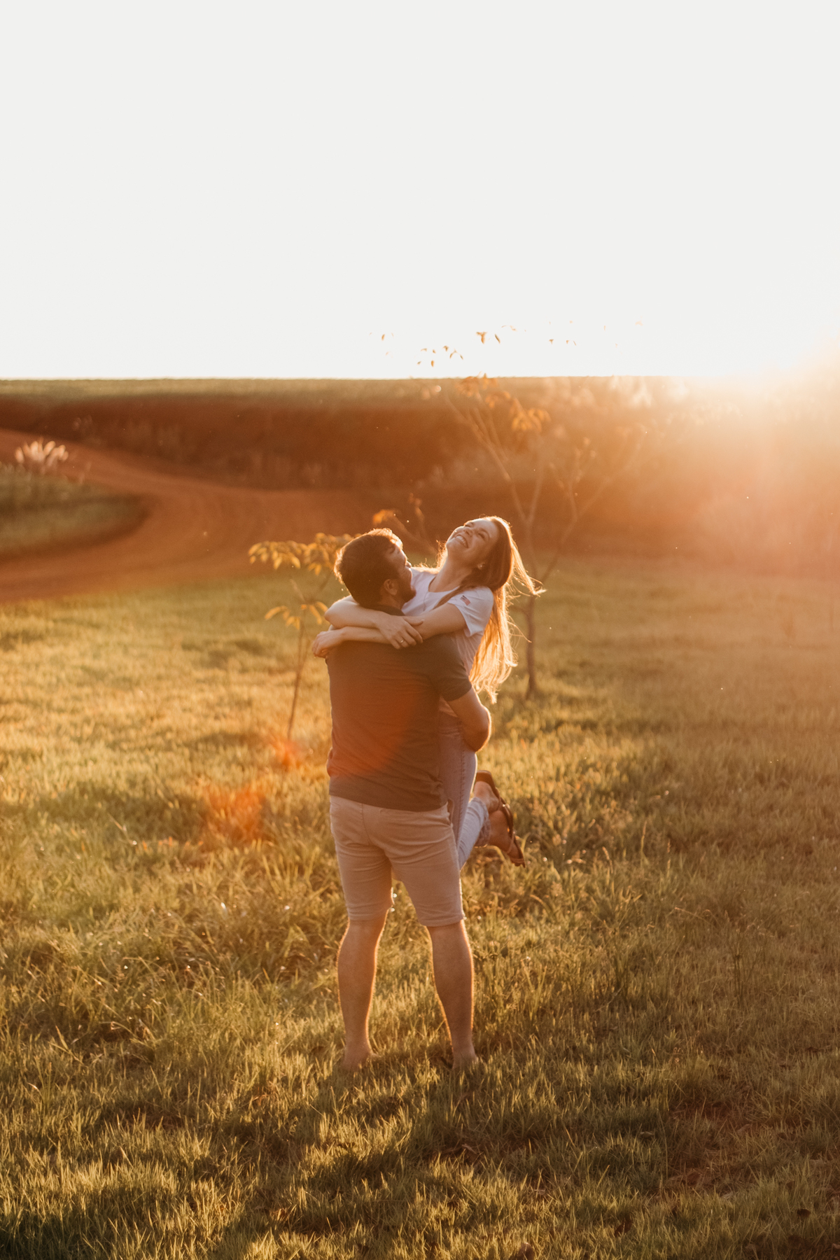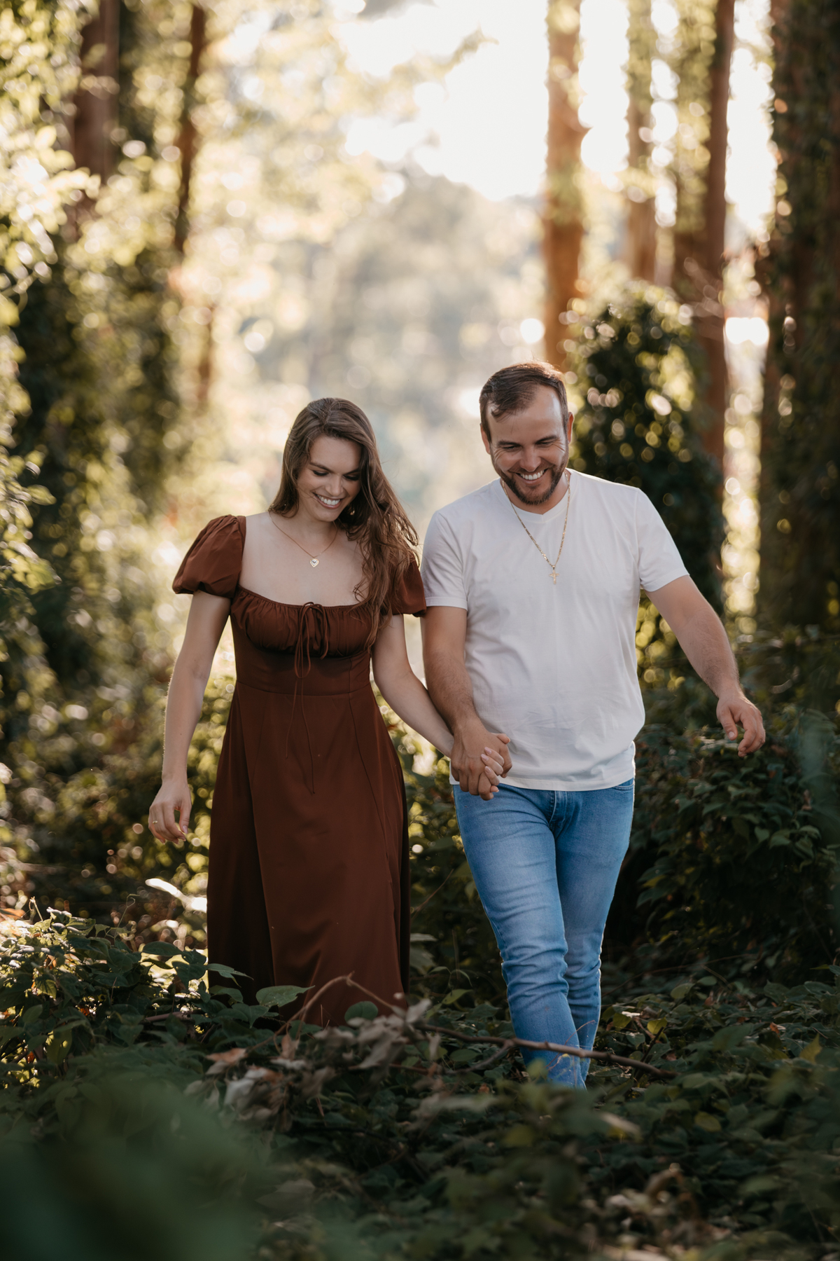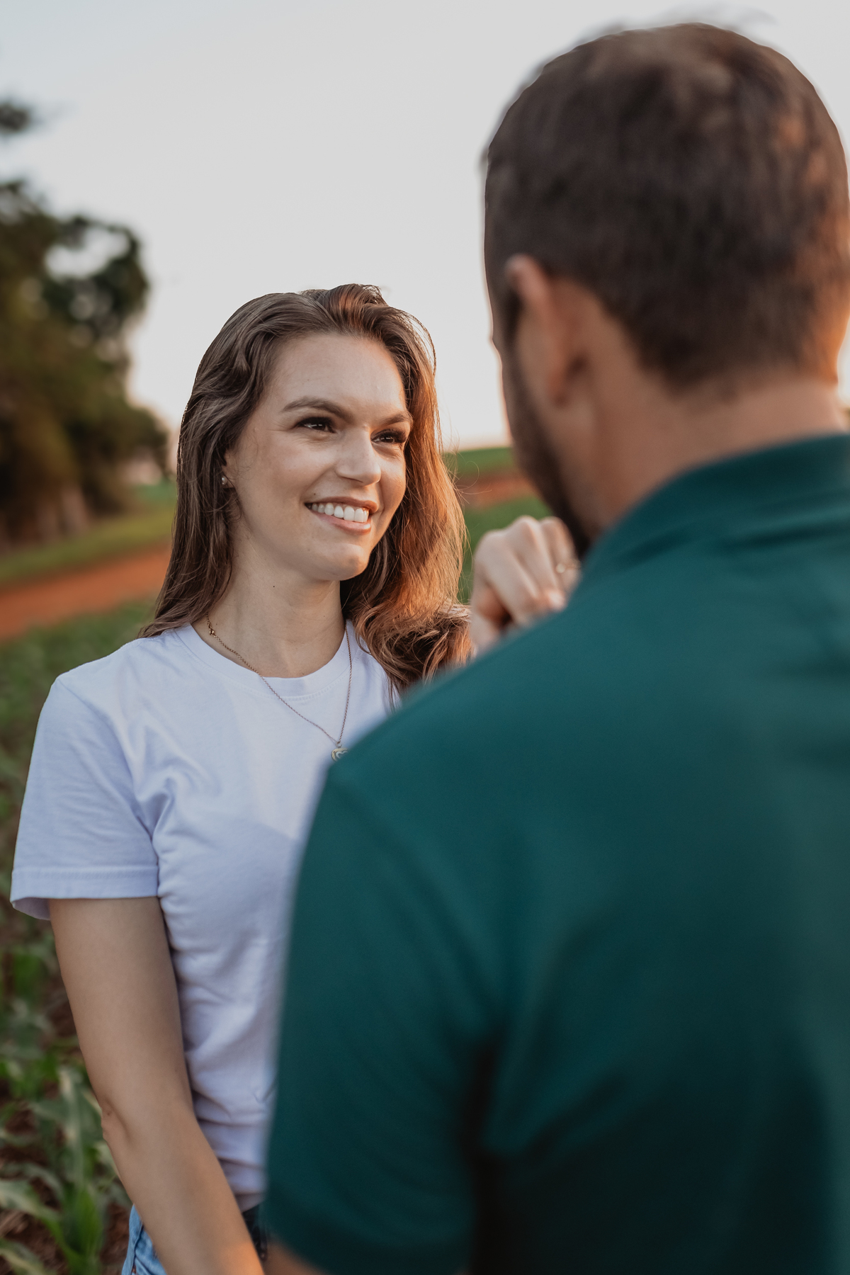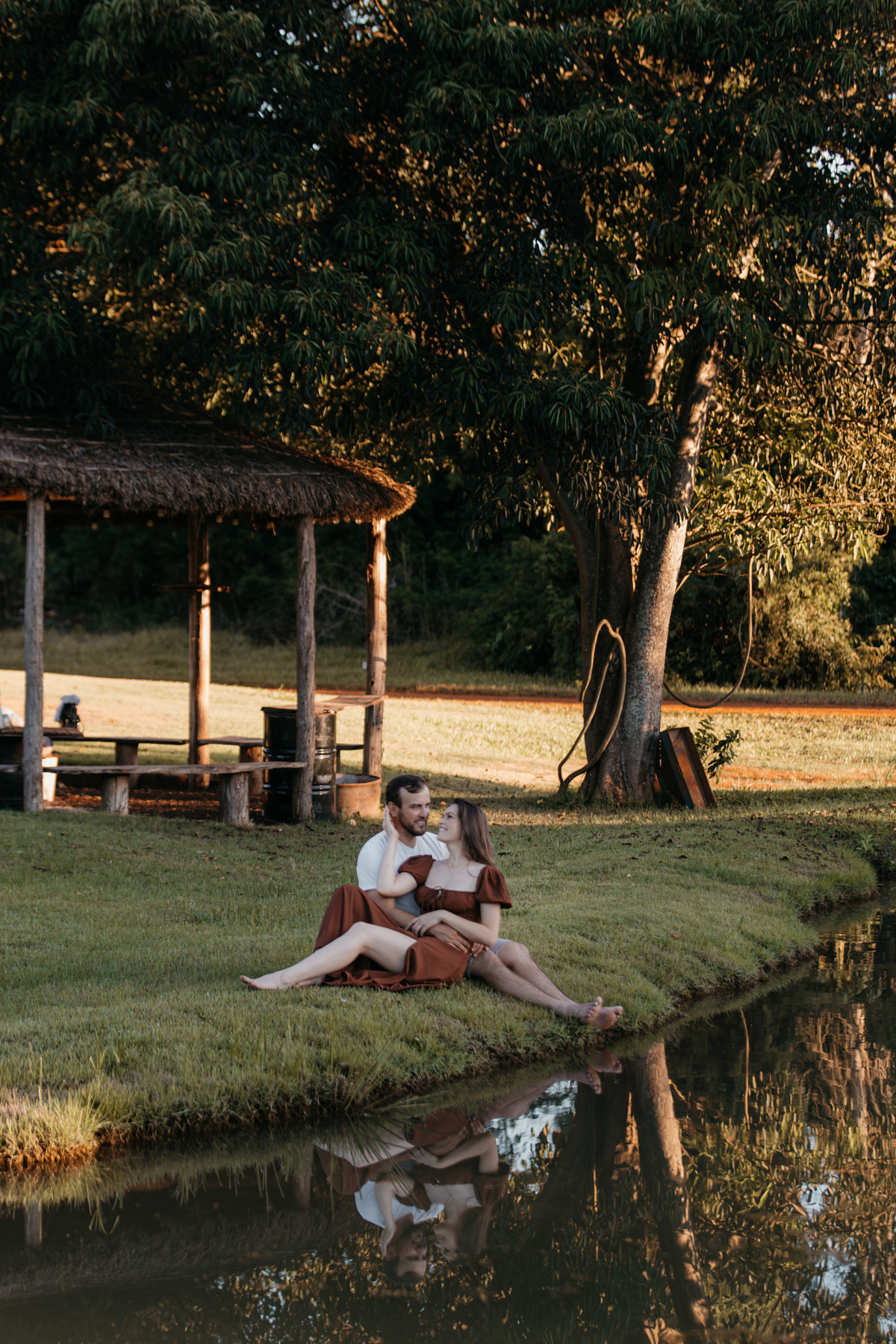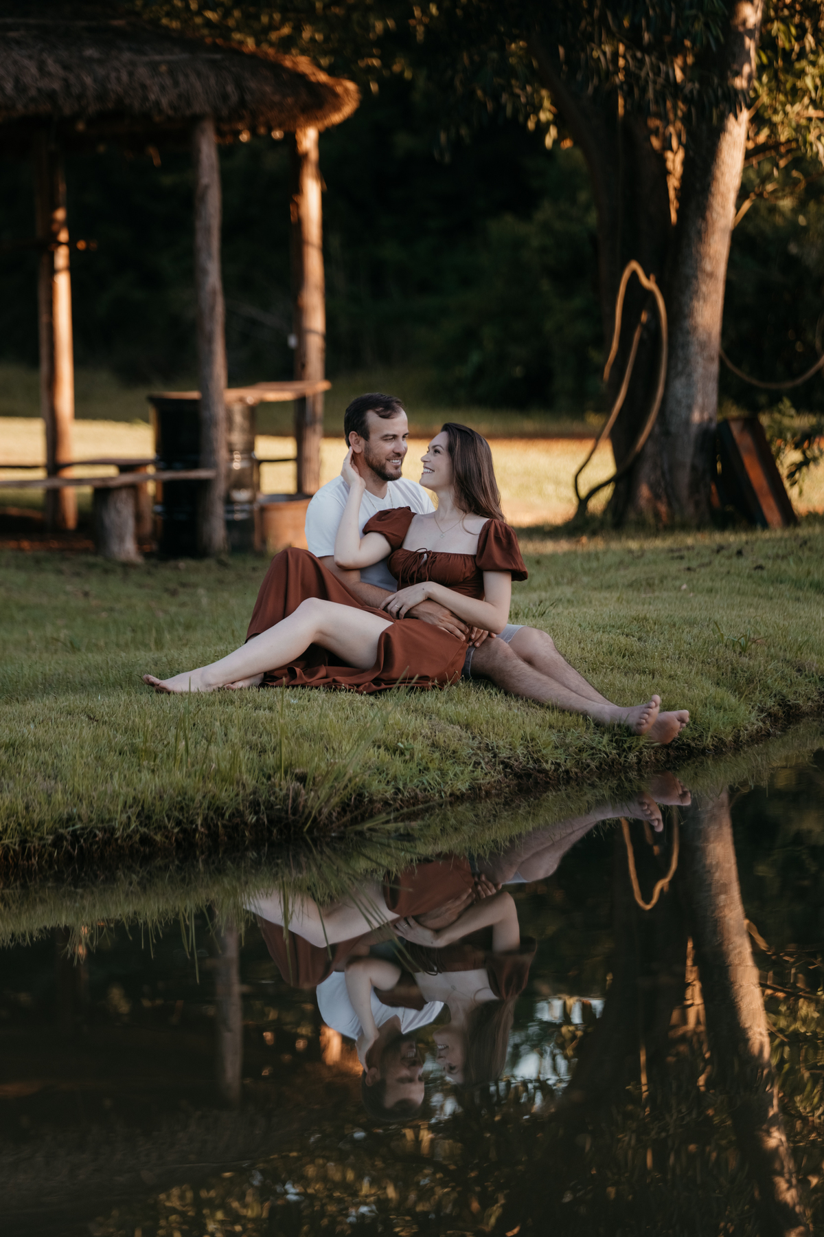 Tivemos uma tarde linda, céu limpo, clima agradável e um belo entardecer. Começamos o ensaio em um bosque, onde a luz do sol atravessava suavemente as árvores, criando um belo cenário.