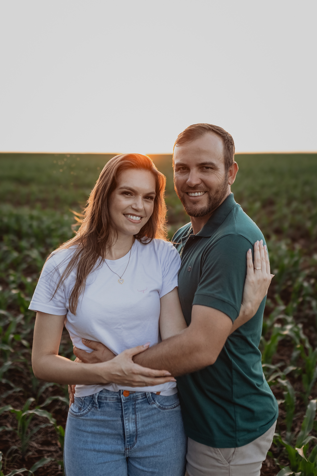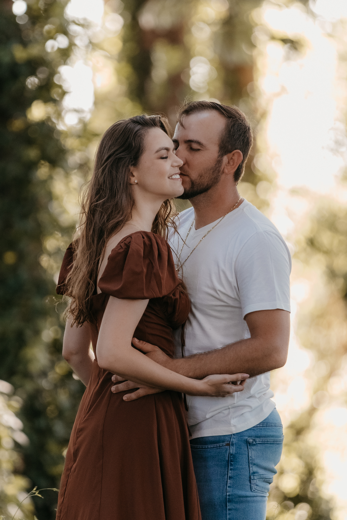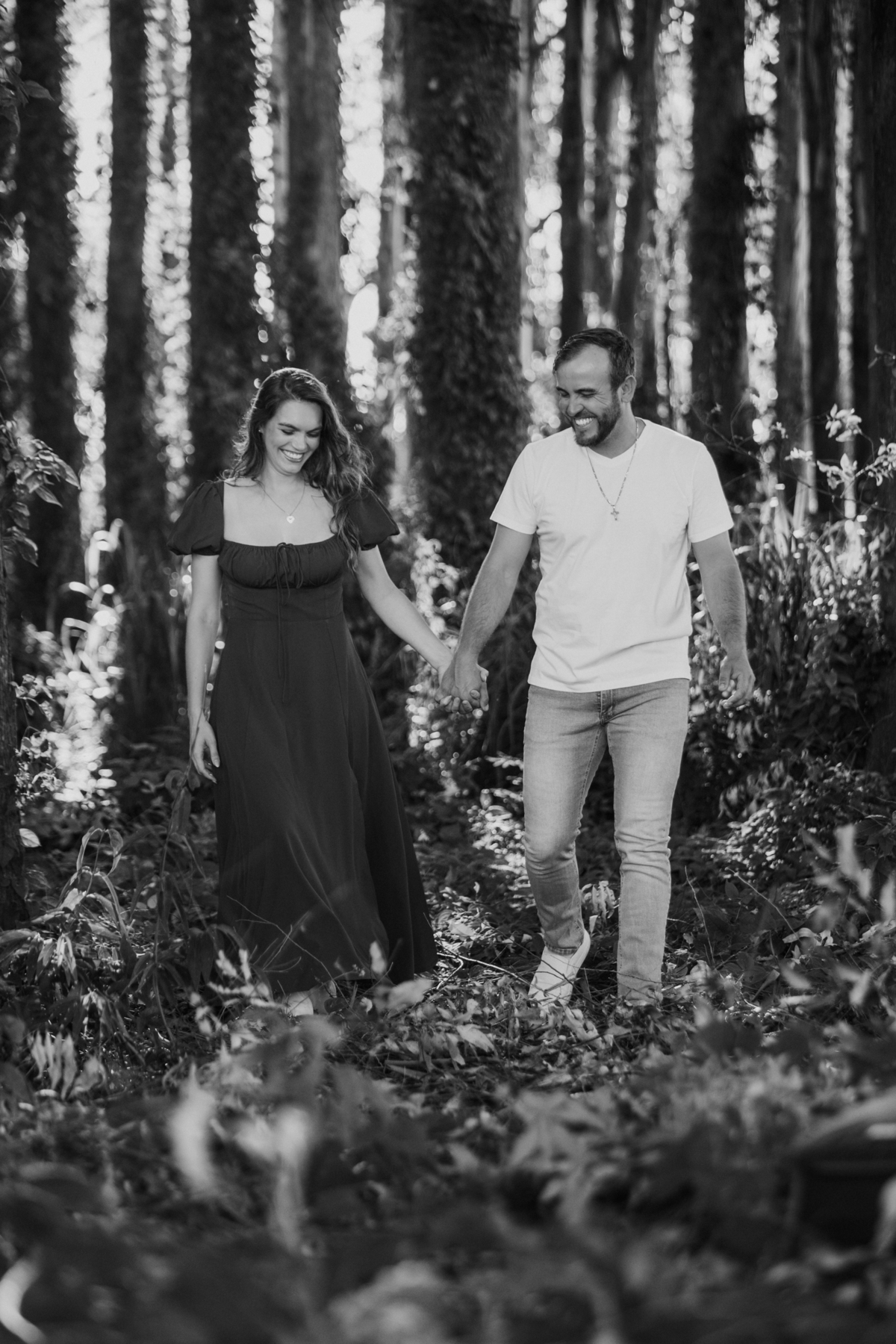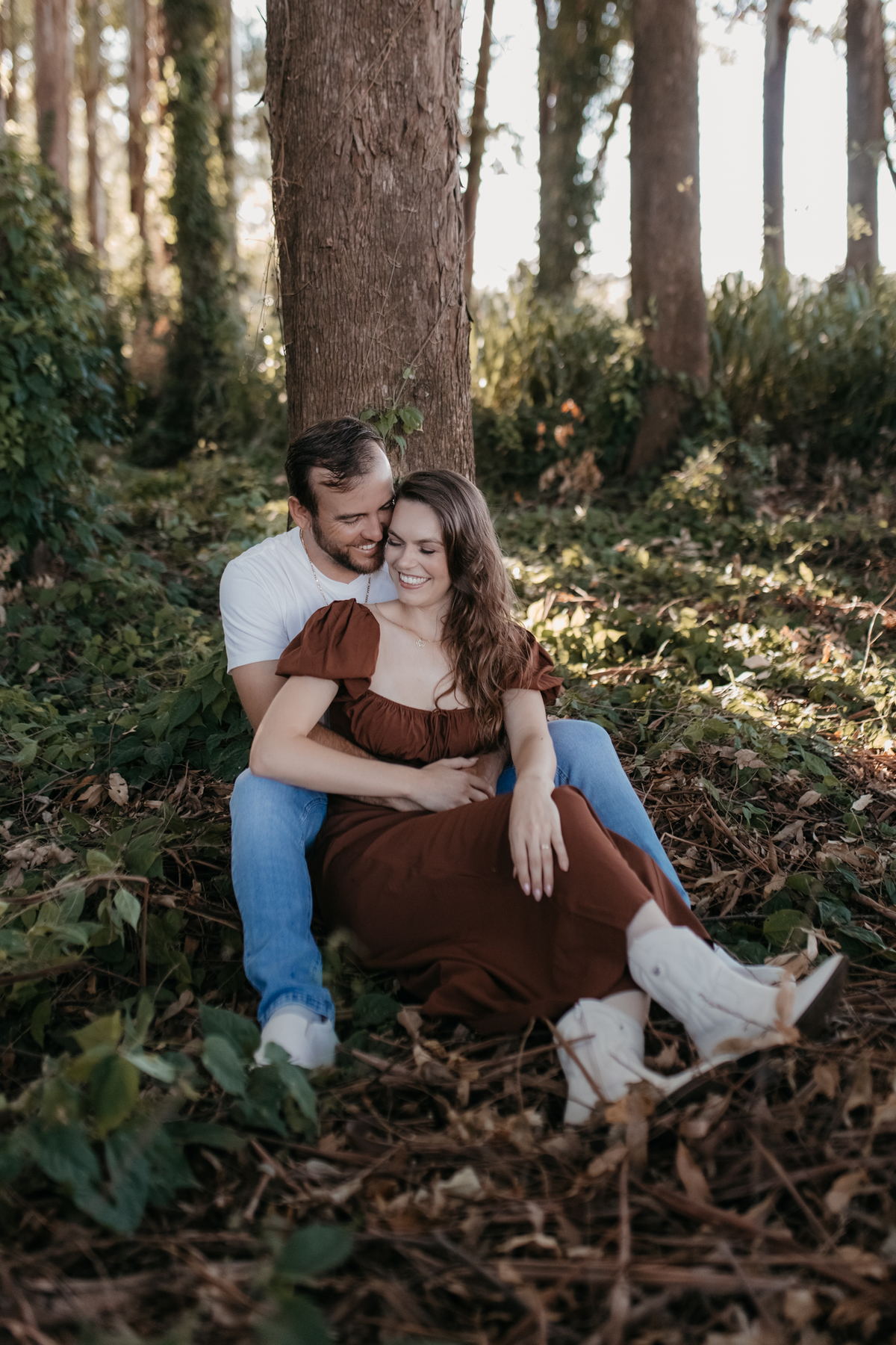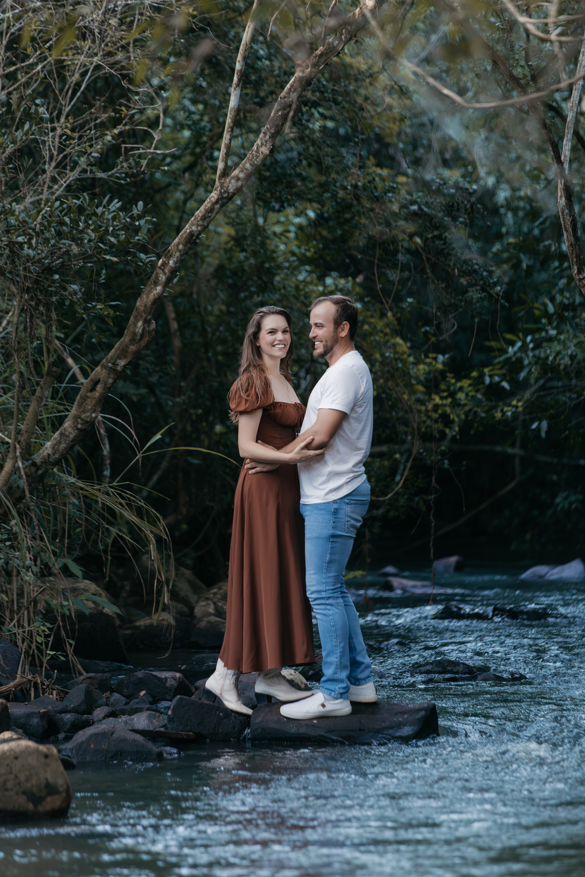 Tivemos uma tarde linda, céu limpo, clima agradável e um belo entardecer. Começamos o ensaio em um bosque, onde a luz do sol atravessava suavemente as árvores, criando um belo cenário.