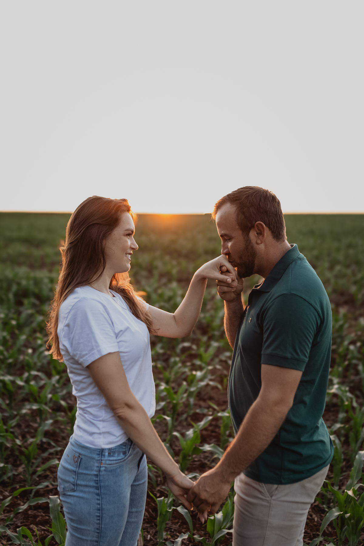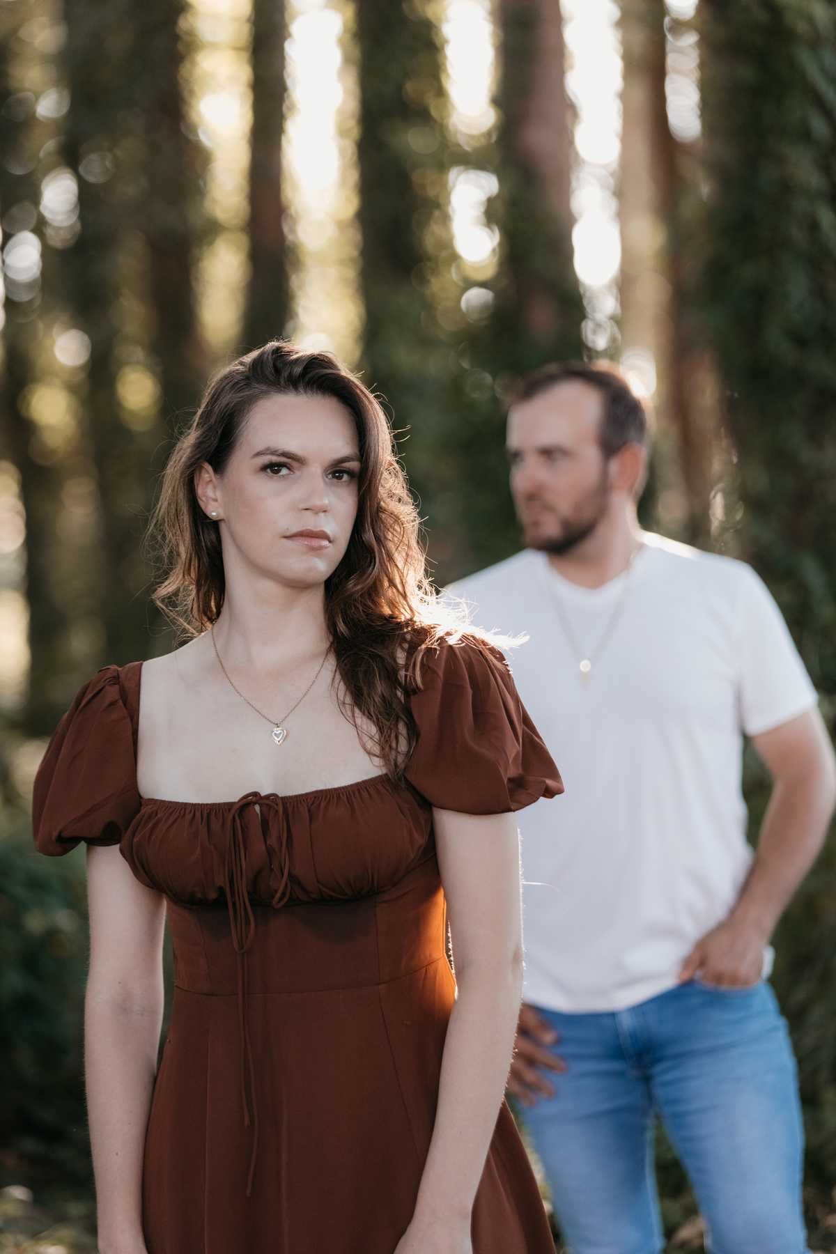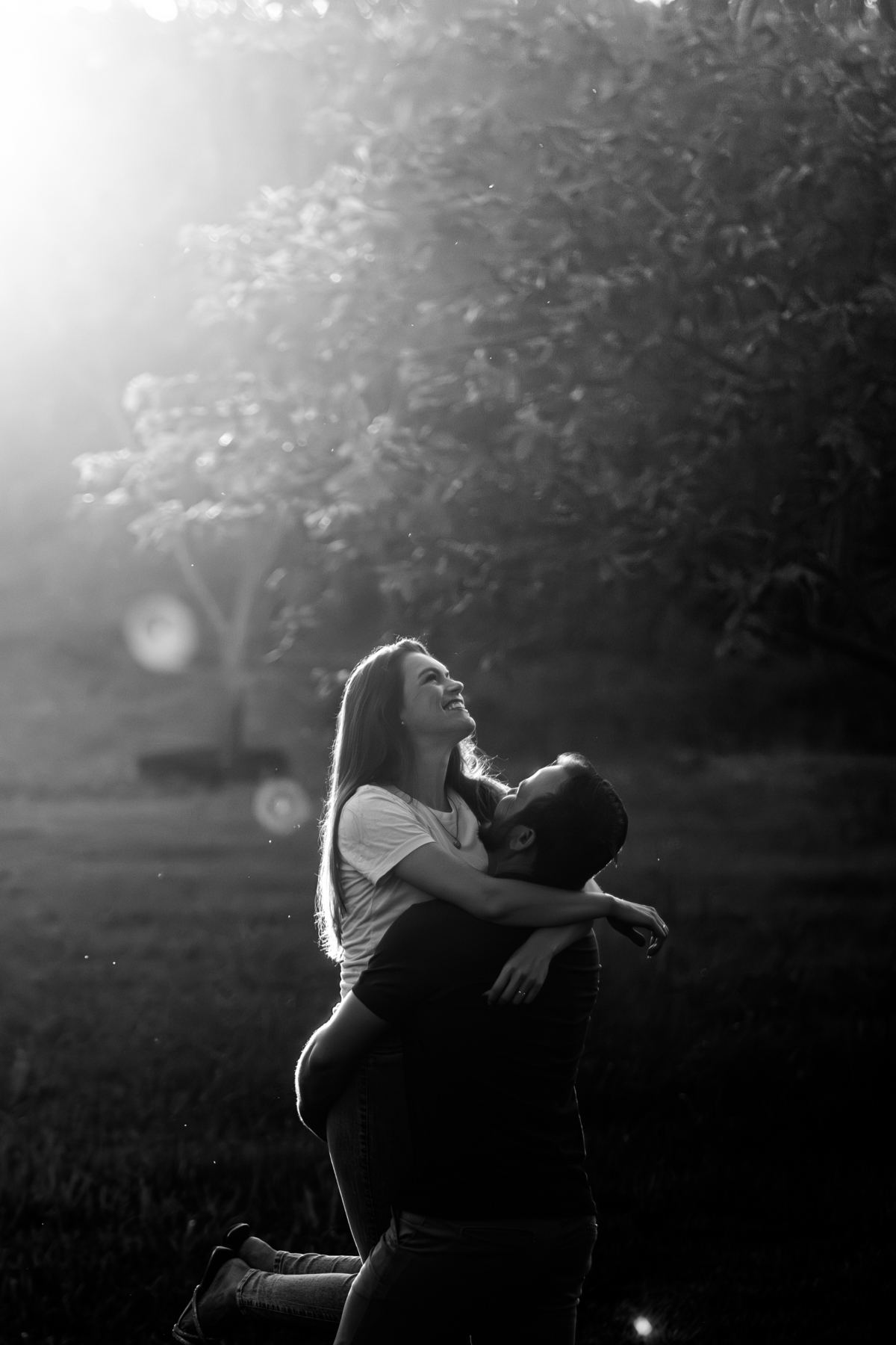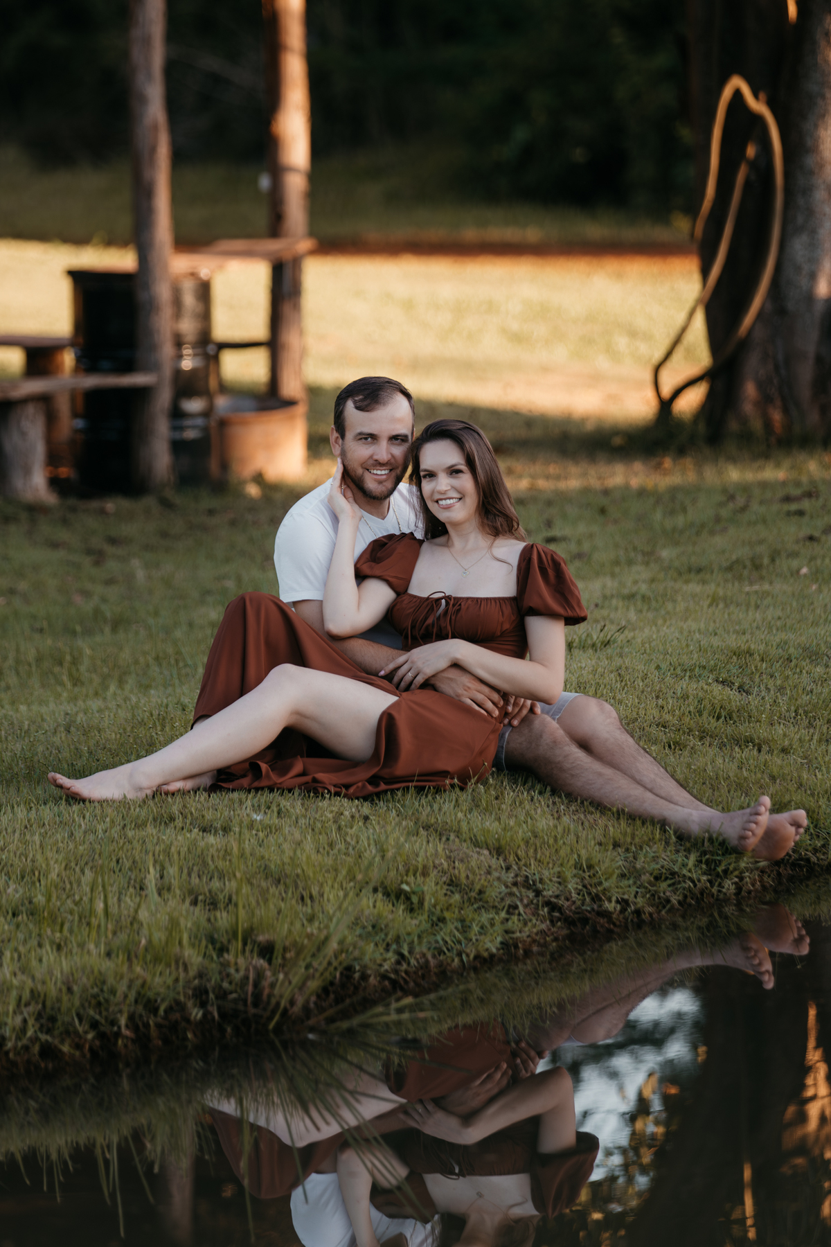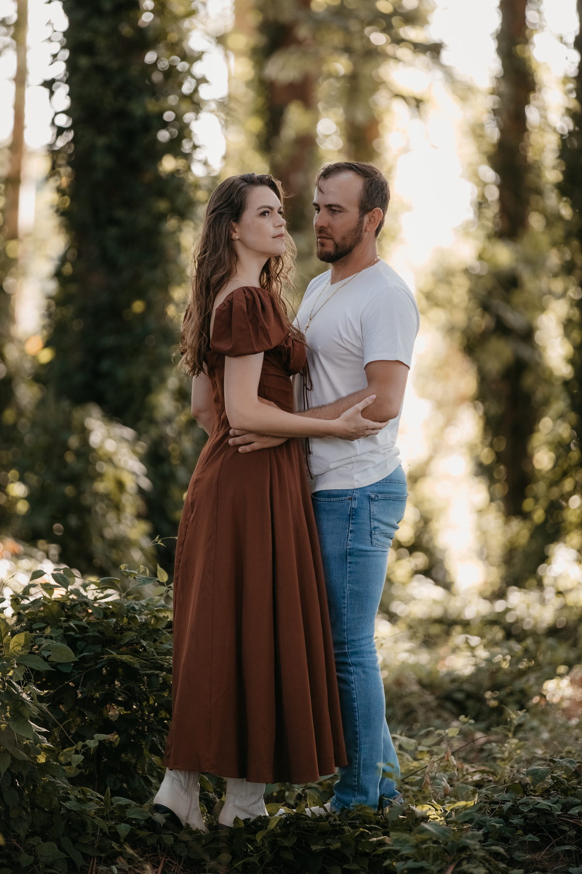 Tivemos uma tarde linda, céu limpo, clima agradável e um belo entardecer. Começamos o ensaio em um bosque, onde a luz do sol atravessava suavemente as árvores, criando um belo cenário.
