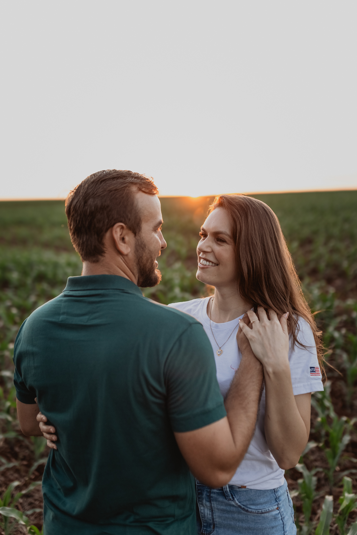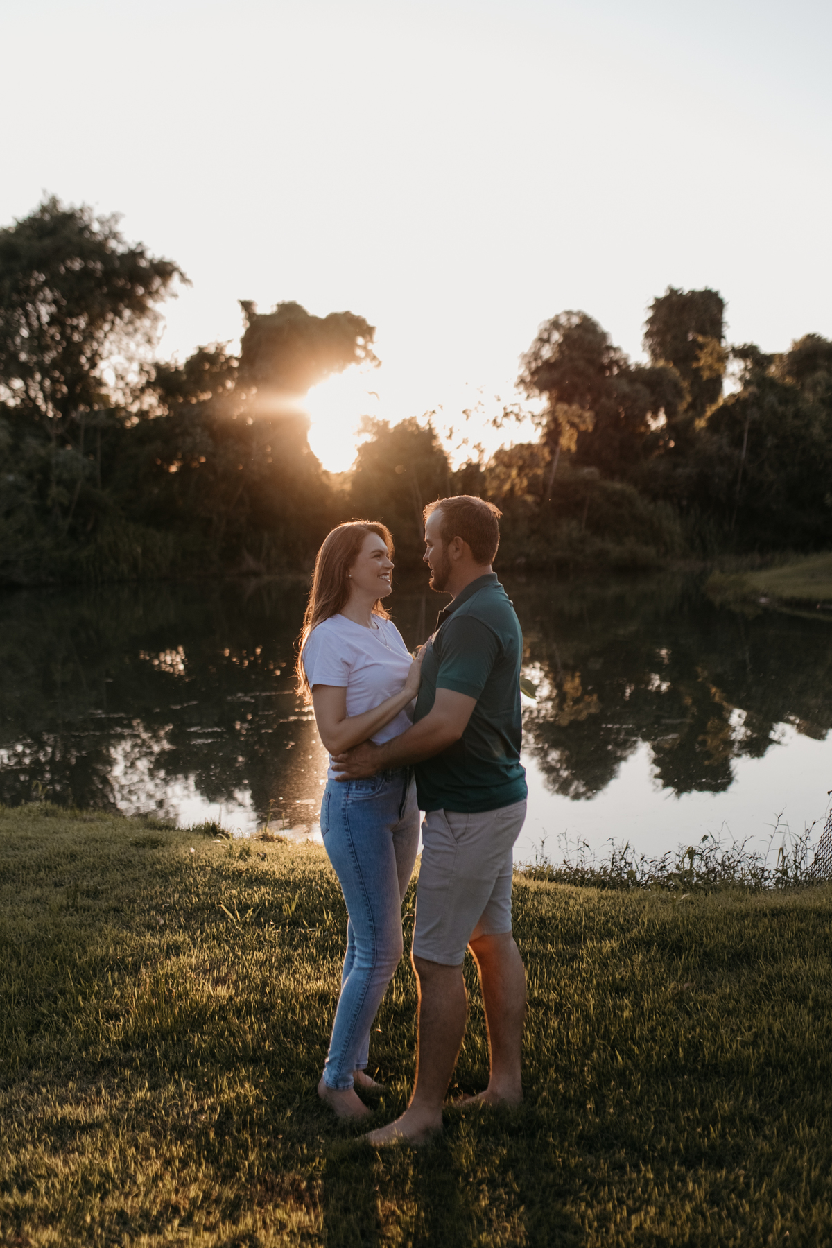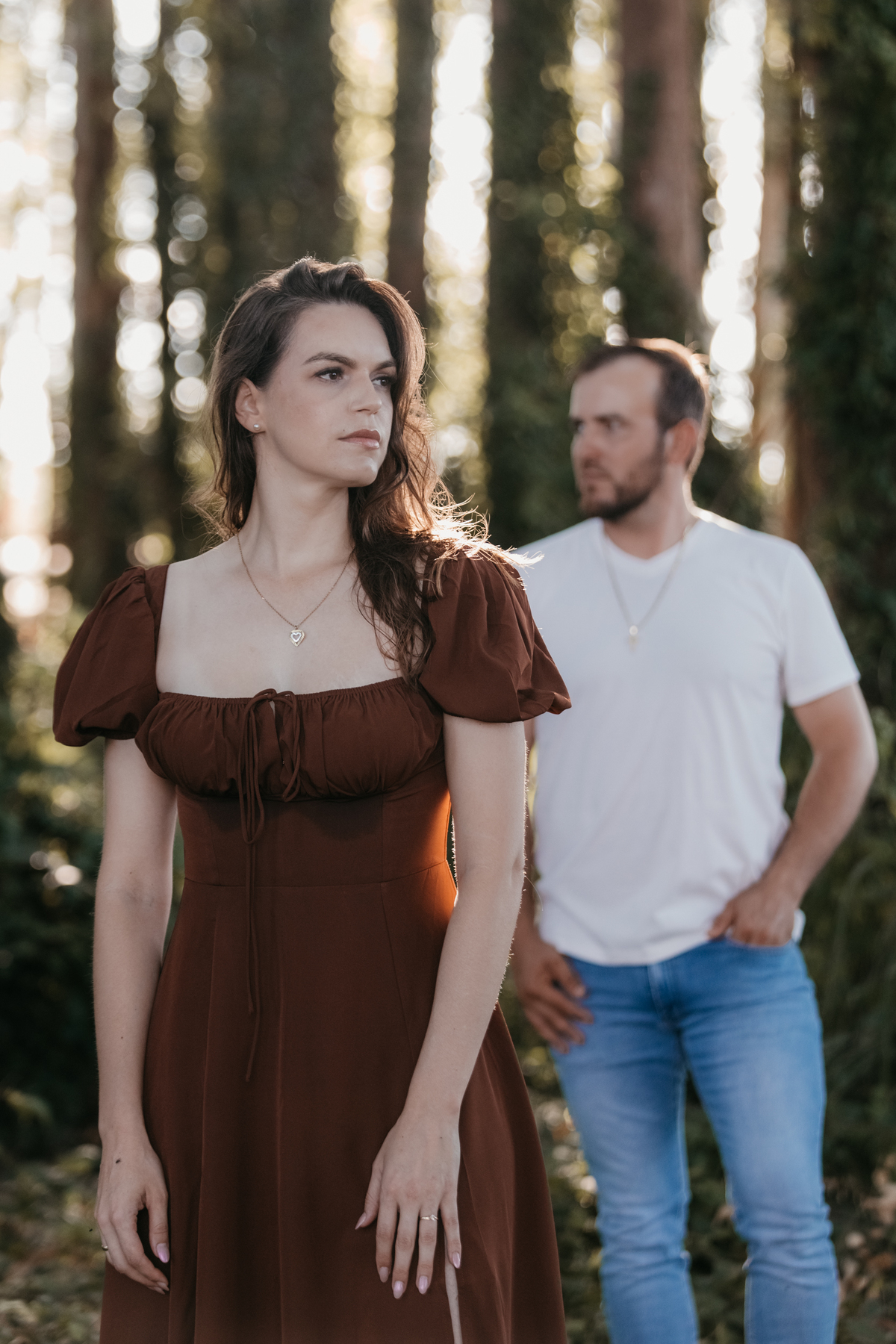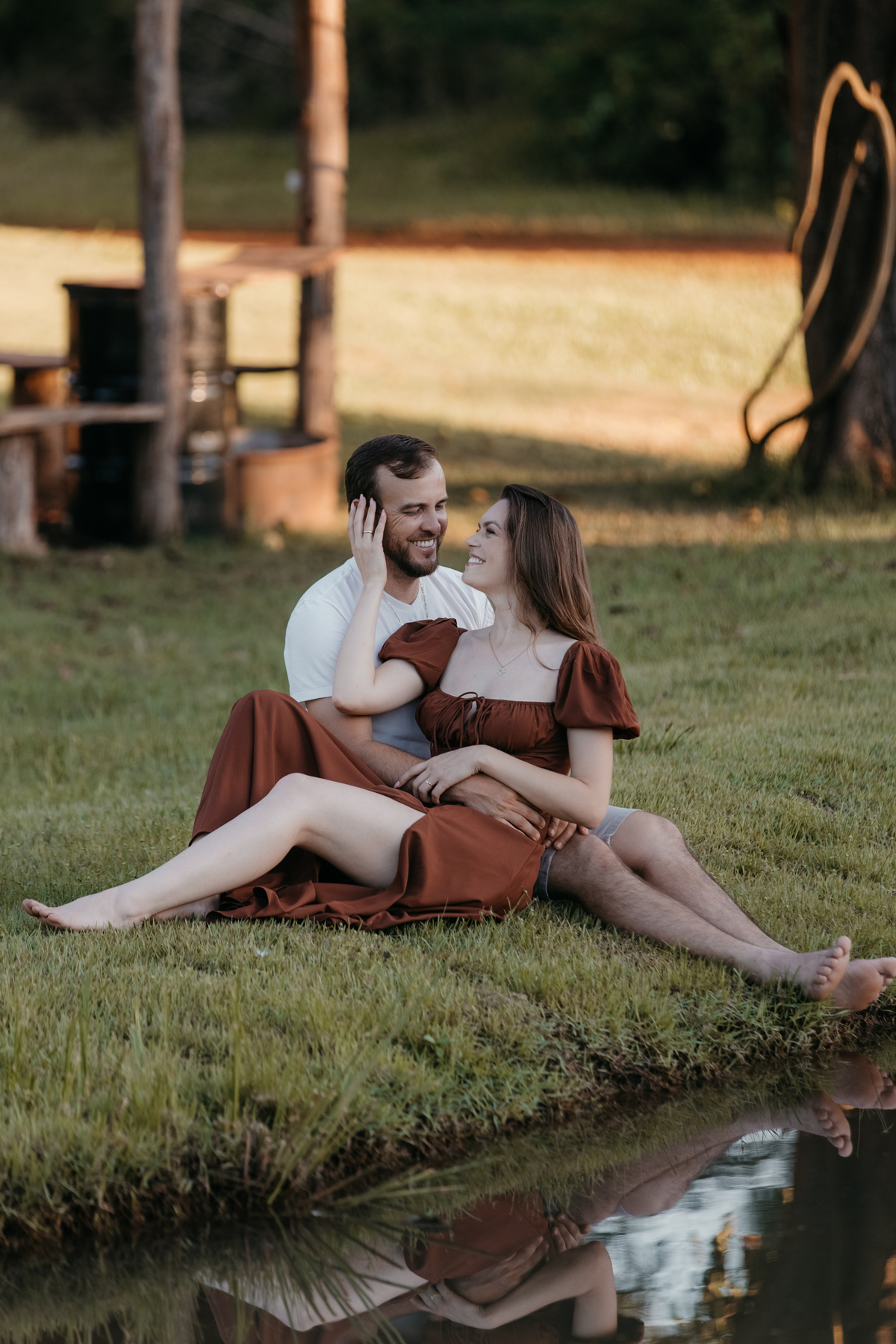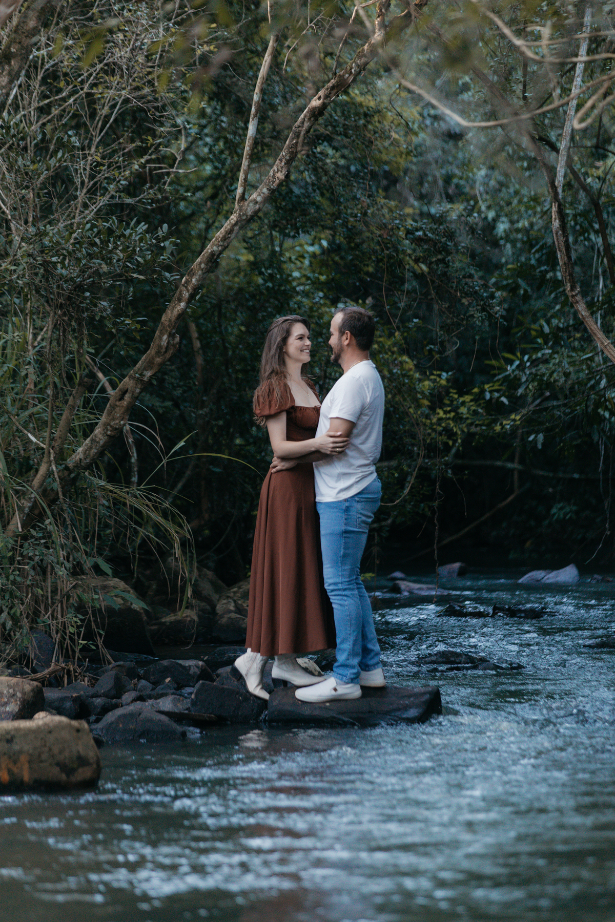 Tivemos uma tarde linda, céu limpo, clima agradável e um belo entardecer. Começamos o ensaio em um bosque, onde a luz do sol atravessava suavemente as árvores, criando um belo cenário.