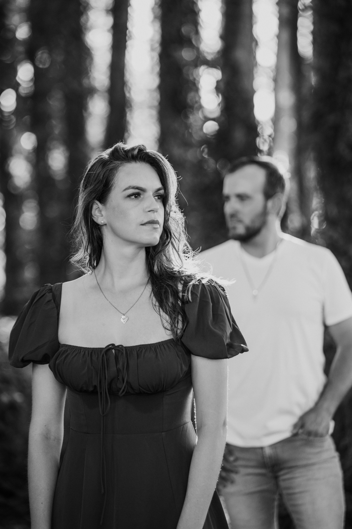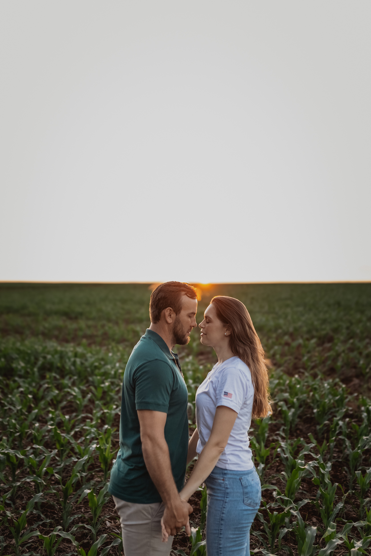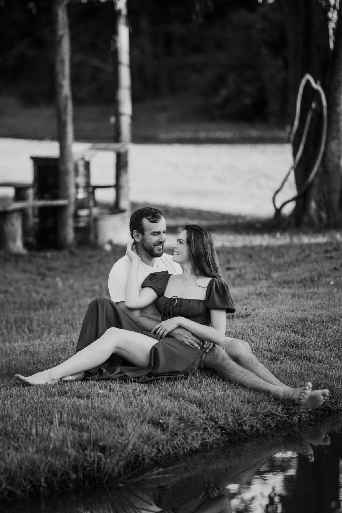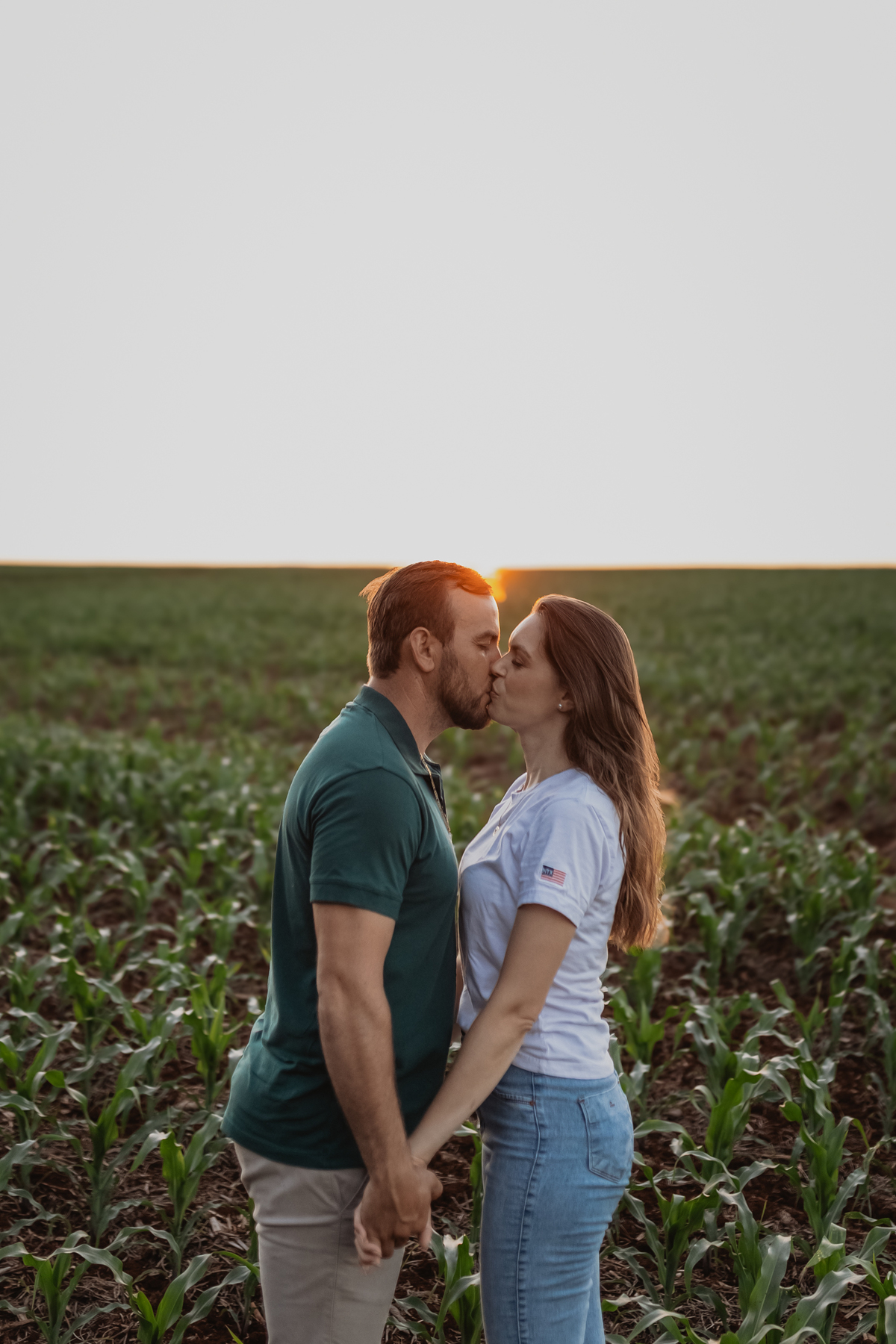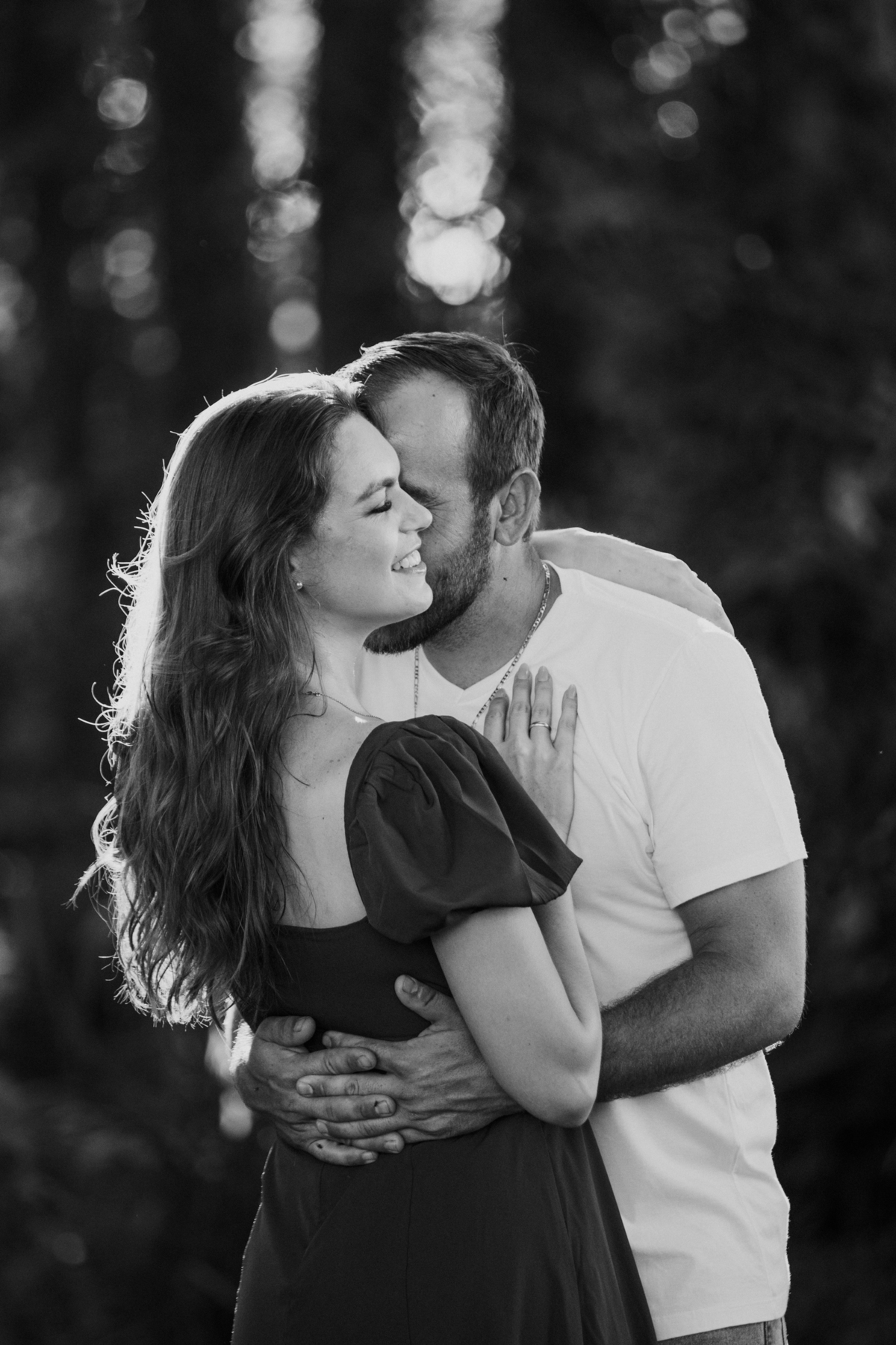 Tivemos uma tarde linda, céu limpo, clima agradável e um belo entardecer. Começamos o ensaio em um bosque, onde a luz do sol atravessava suavemente as árvores, criando um belo cenário.